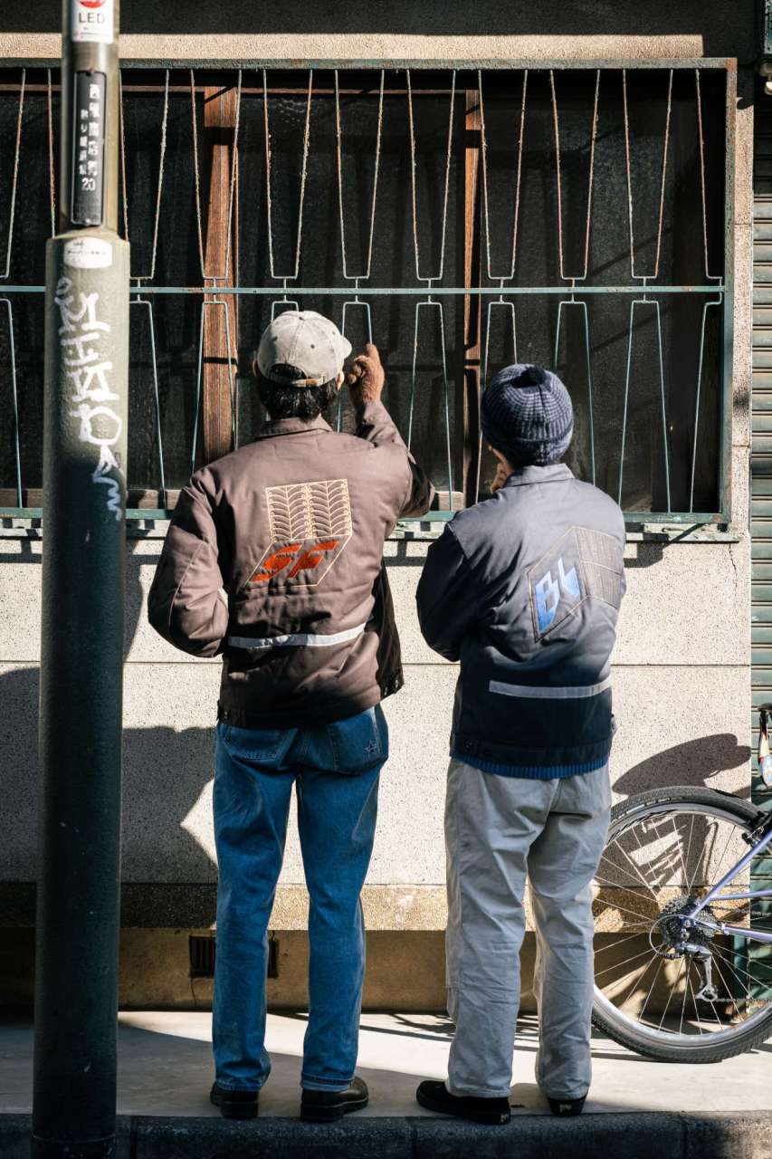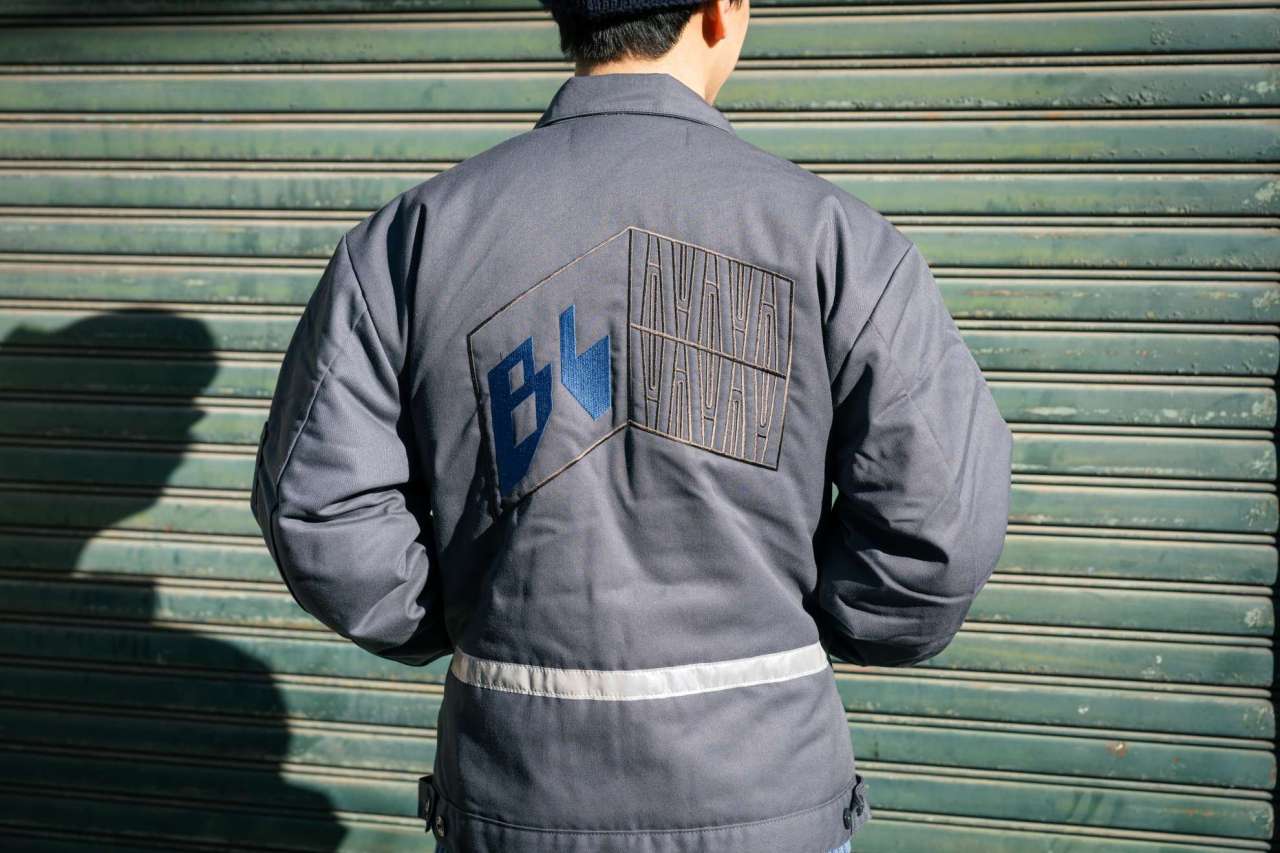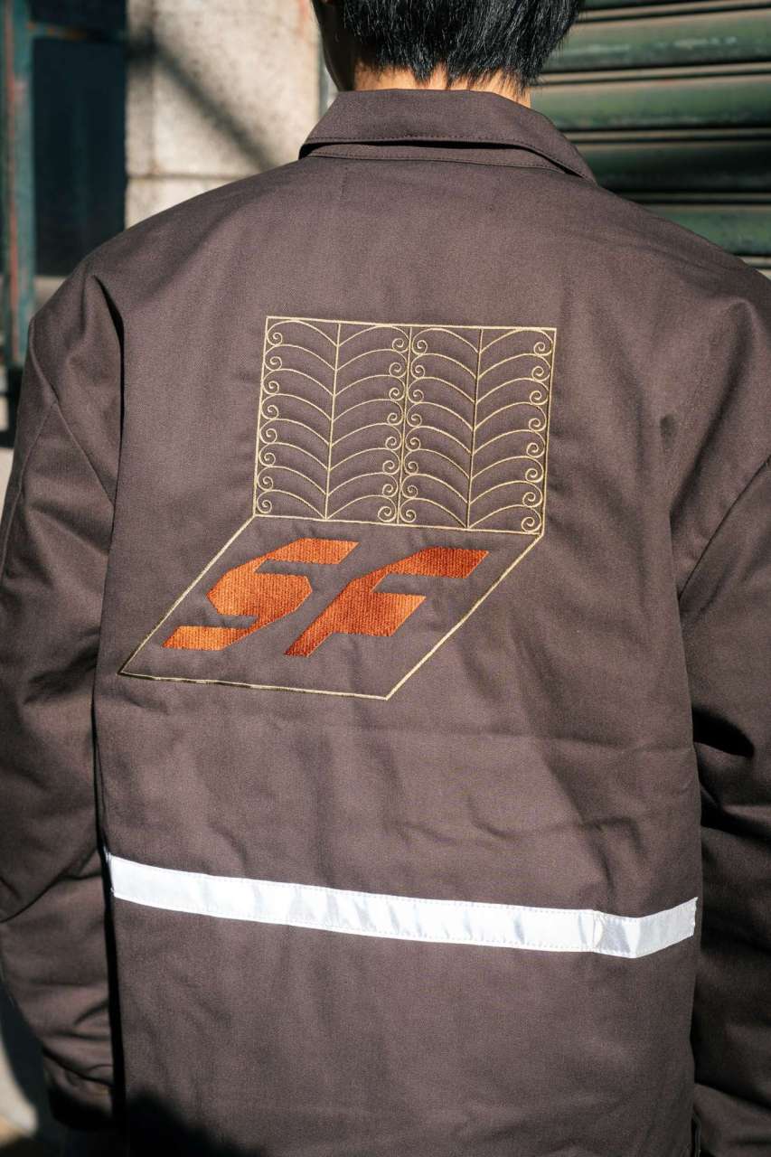 And so we made work jackets! Jeffrey’s work is embroidered hugely on the back of Red Kap work jackets and we’ve added a reflective tape on the lower back area. Gotta have some bikey detail right?