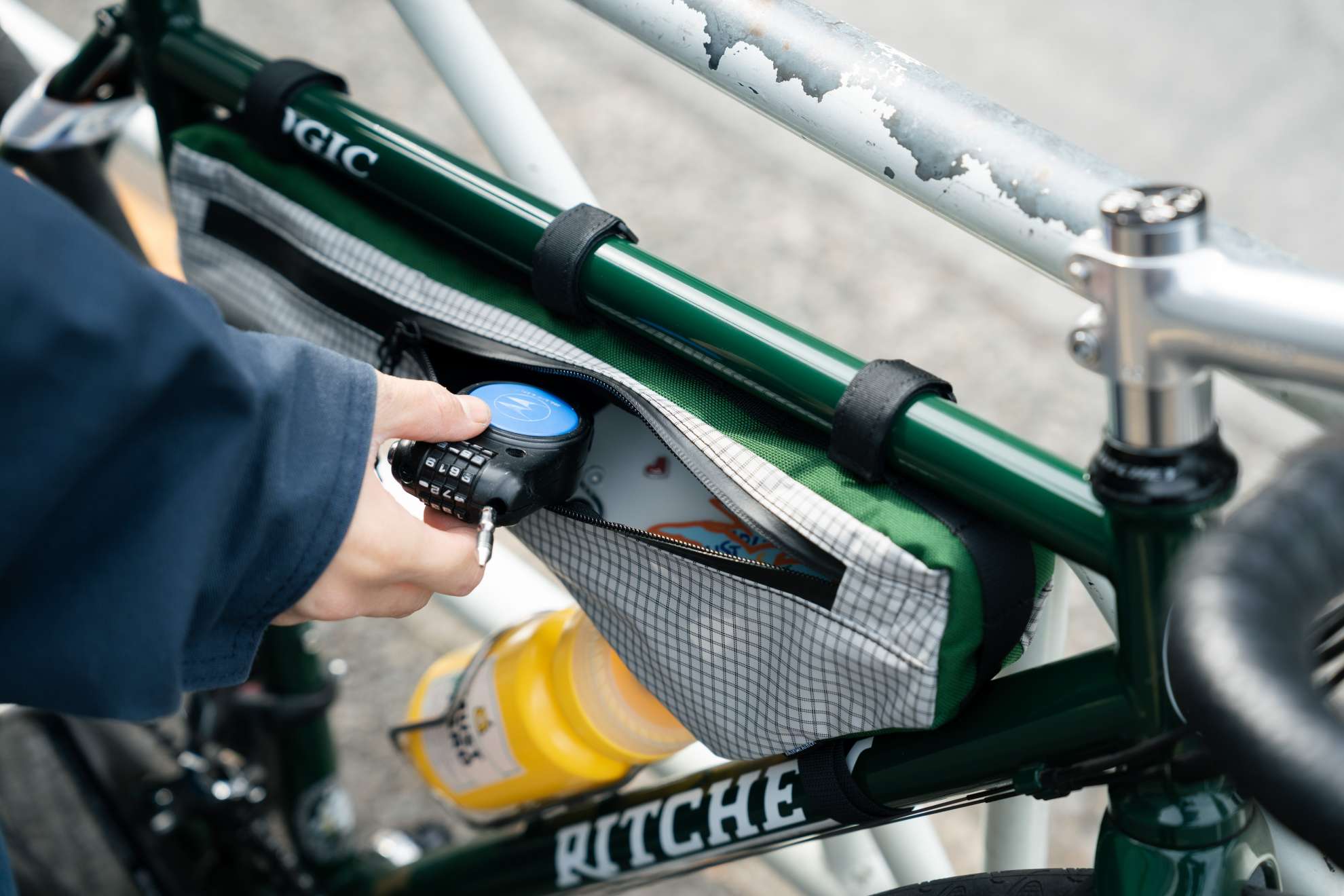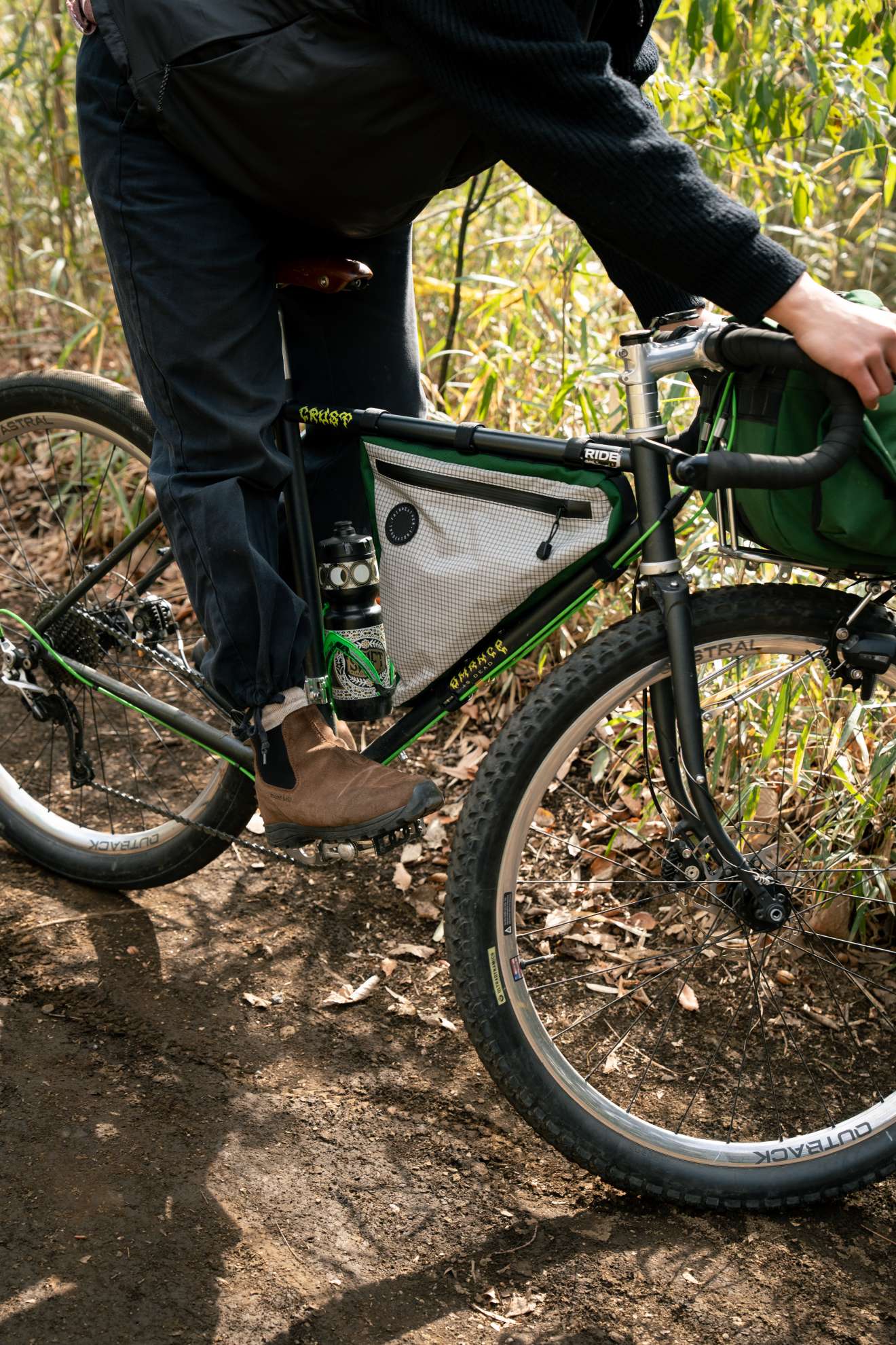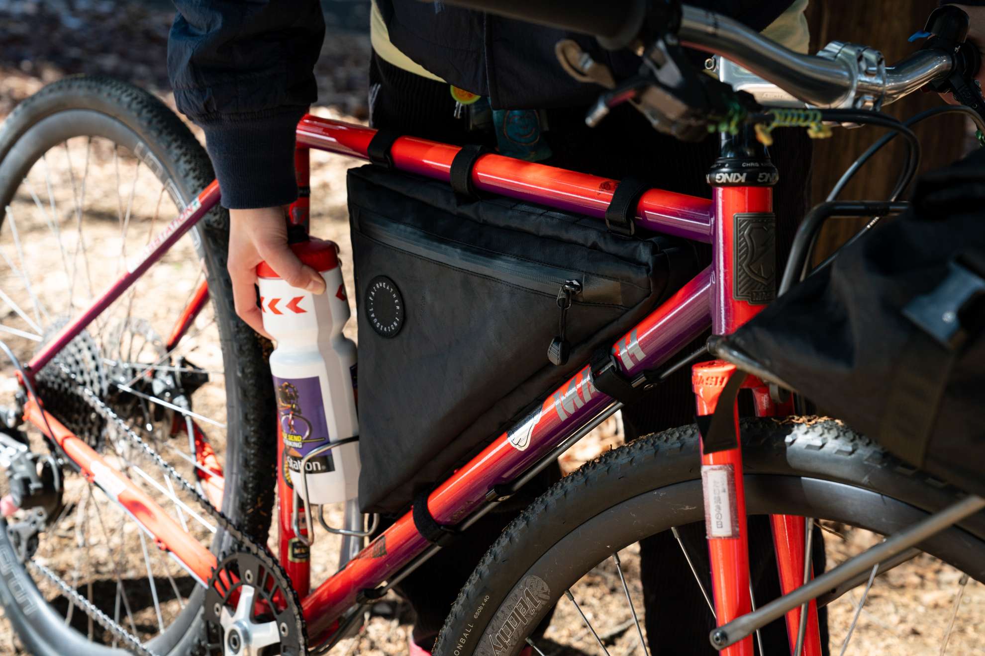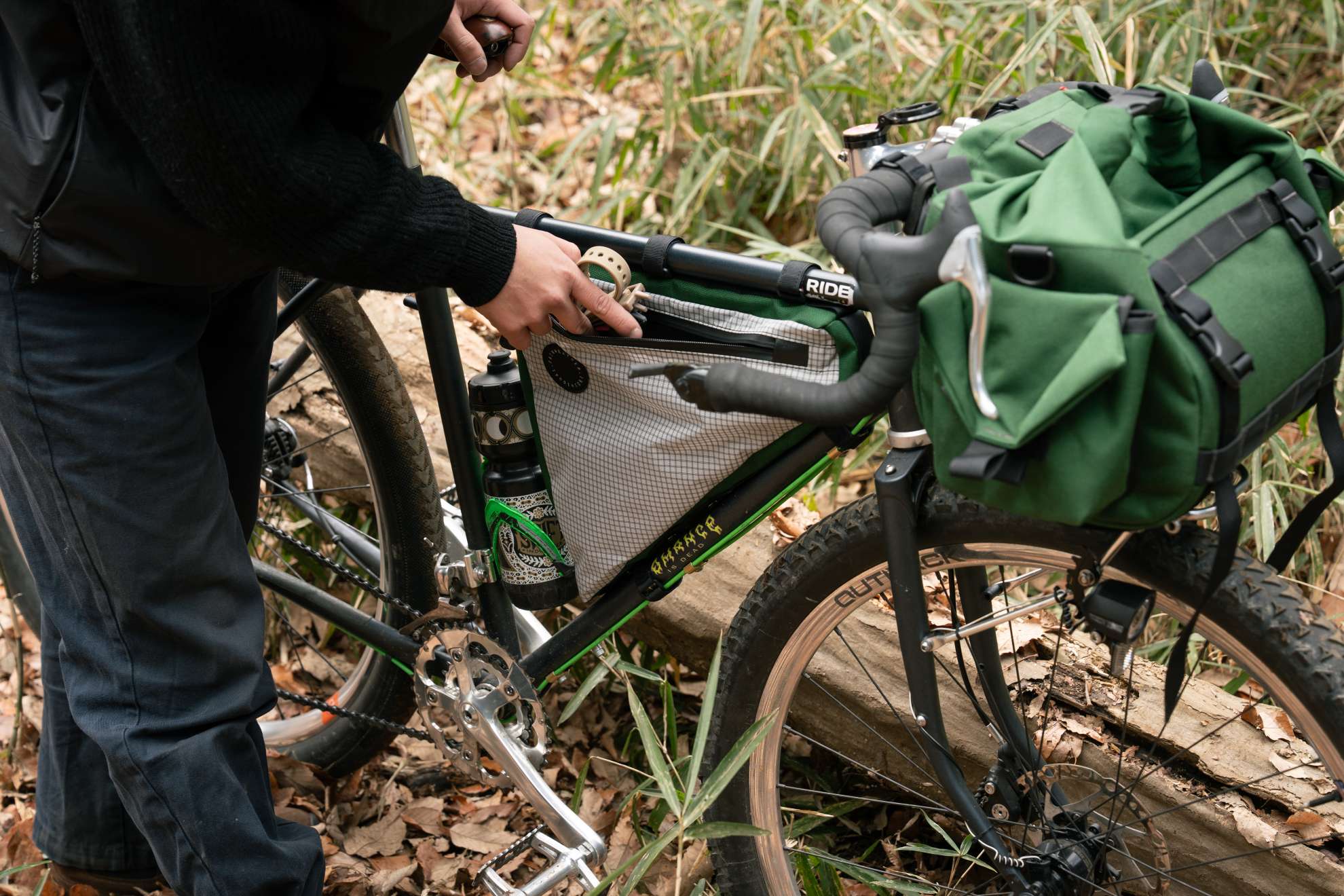 The bag that’s on Kaisei’s Fairweather Dodo is the Frame Bag ADV. The “ADV” stands for “Adventure” and “Advance”. It can hold a lot of stuff, while having access to one cage mount.