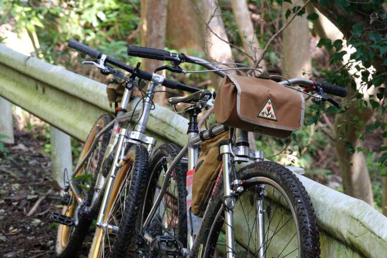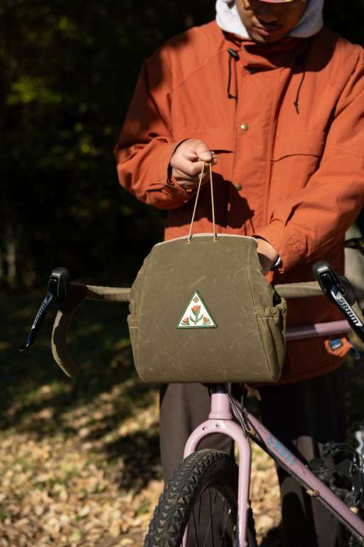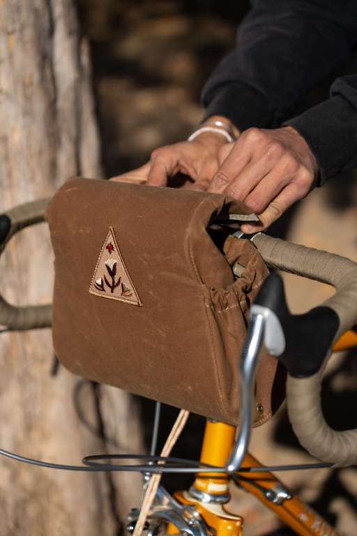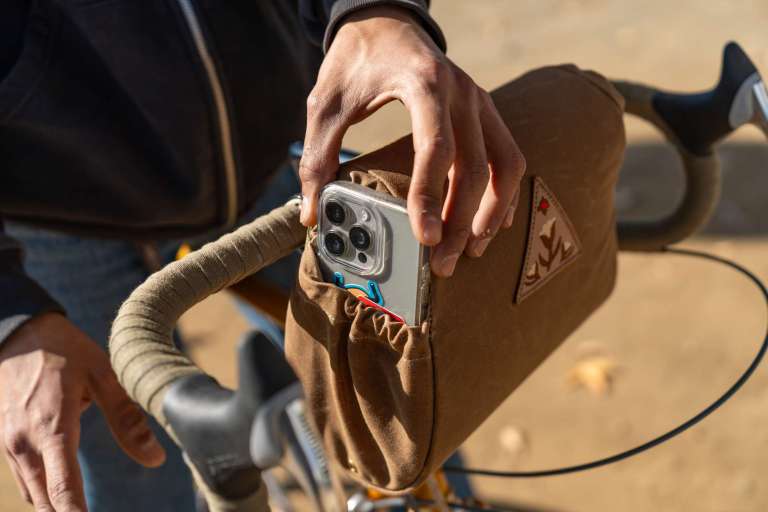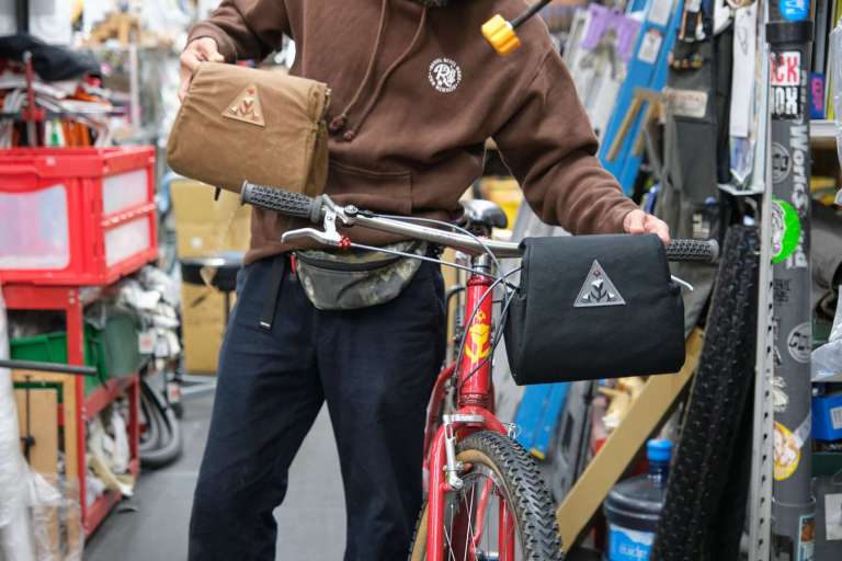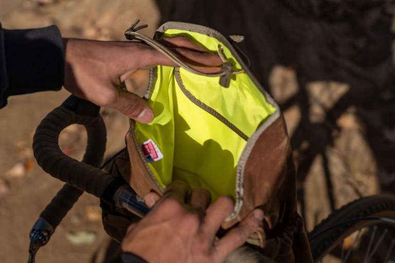 サドル上視点からバッグ内へのアクセスが抜群に向上する「手前開け仕様」のハンドルバーバッグ。サイドポケットも追加され、利便性は過去一で良いと思います。