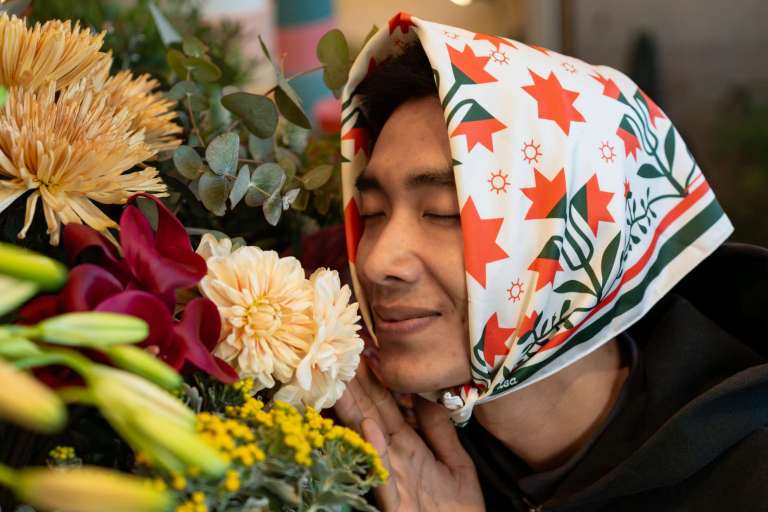 larons tulips and holly bandana (periwinkle tan)