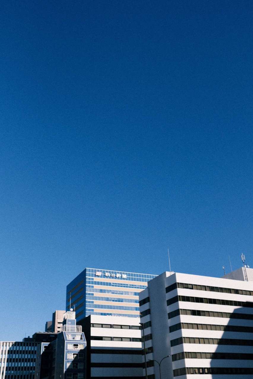 横を見ると朝日新聞社が青空の中、顔を出していたのも良い感じだったので思わずパシャリ。