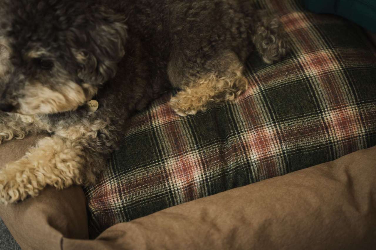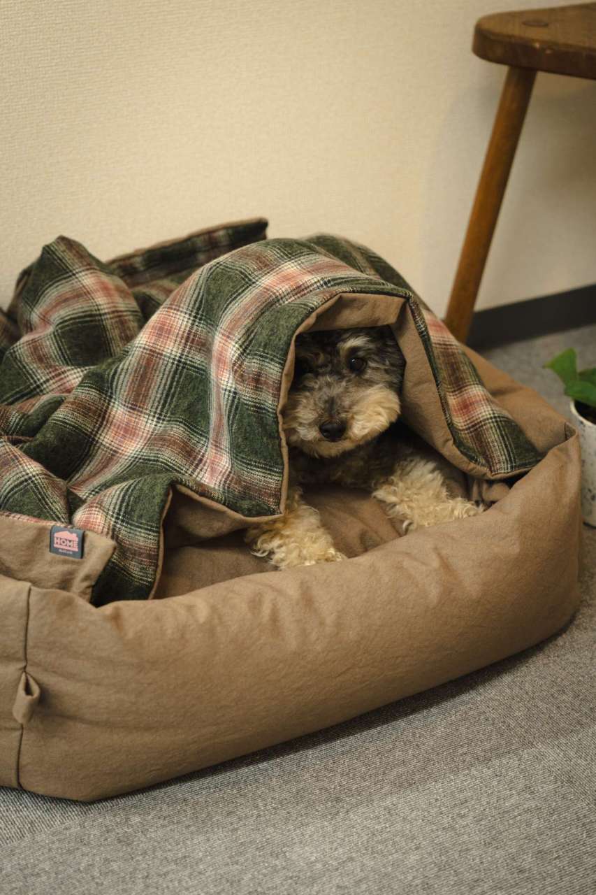 間に厚めの中綿を入れることで保形力を高めているので、上からドームを作るように掛けてあげると、中の温かい空気を逃さず、ぬくぬくと過ごせます。狭くて囲まれた場所を好む犬の習性にぴったり。
