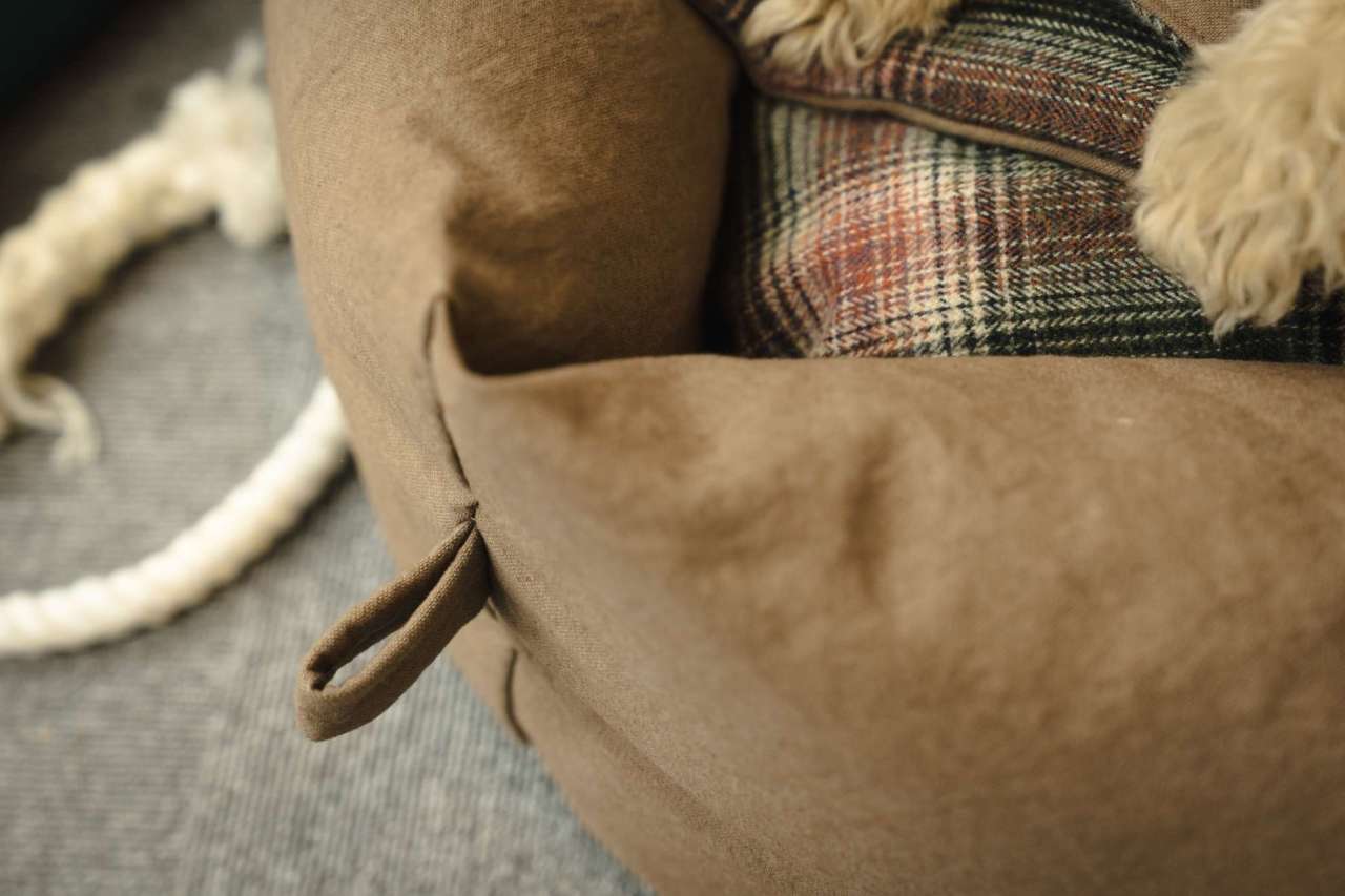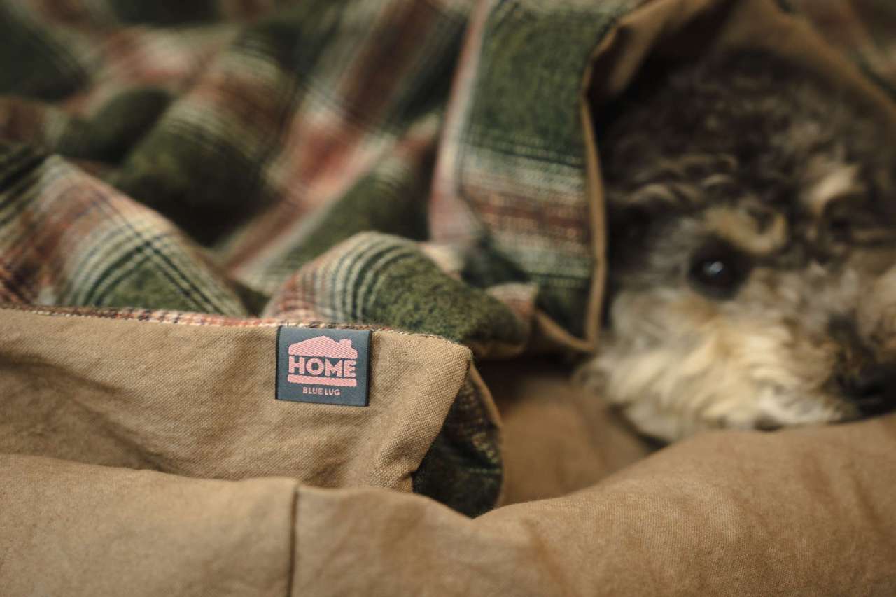 「ネームが飛び出ているのが気になるみたいで、そこから壊しちゃうんです」というお声をよくいただくので、ドッグベッド、パフブランケットのどちらも、織ネームは飛び出さないように処理しています。