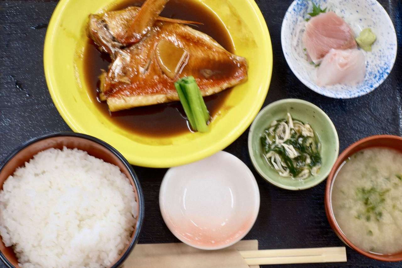 金目鯛をメインにお刺身定食、丼もの、天ぷら定食とさまざまな金目鯛お料理を楽しめる食堂。ぼくは煮付け定食をチョイスしました。