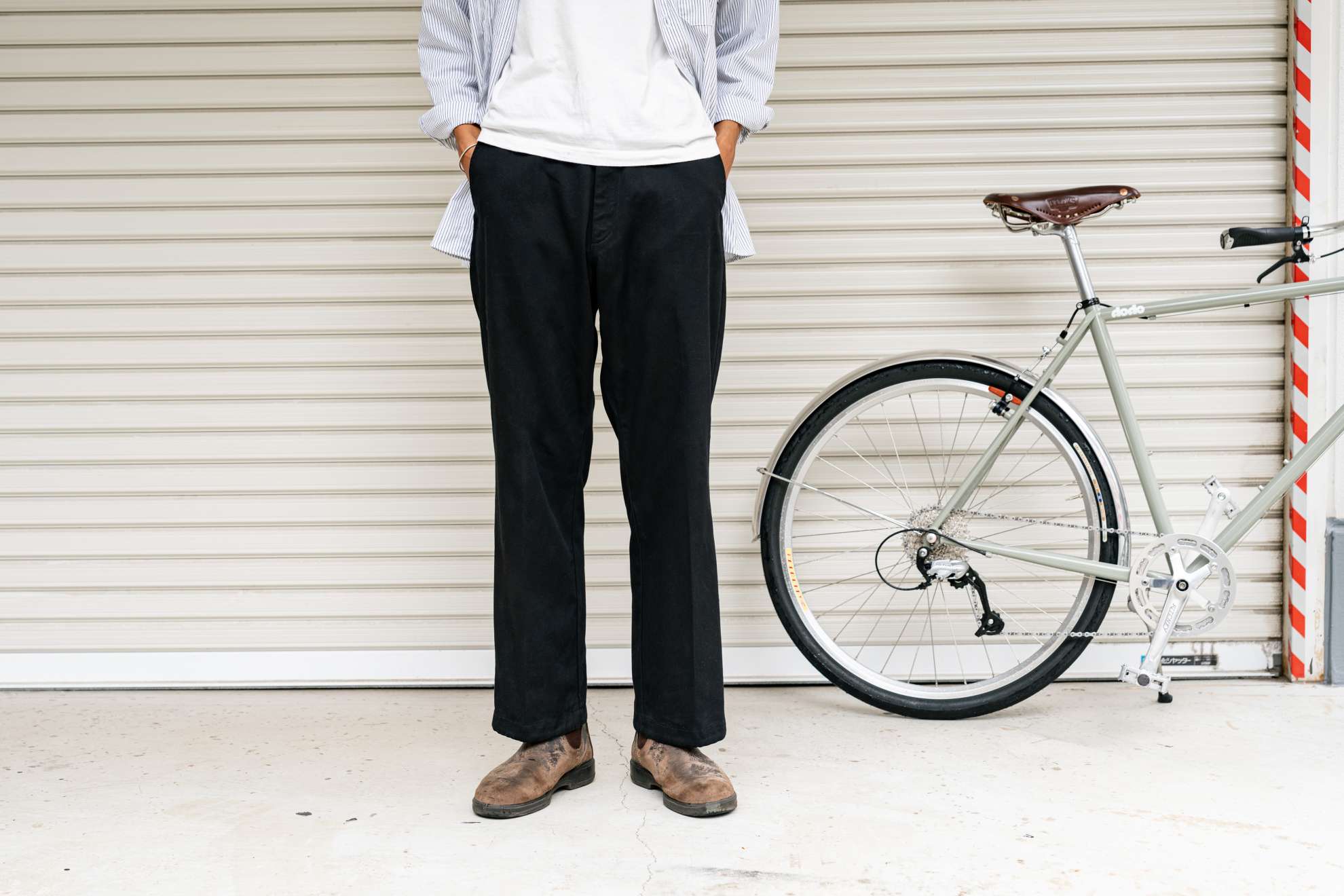 実はチノパンのブラックって意外と世の中には少なかったりして、それはチノパンの歴史や単純な需要の話だと思うんですけど、ワークウエア文脈のブラックパンツは必須であり定番の色。