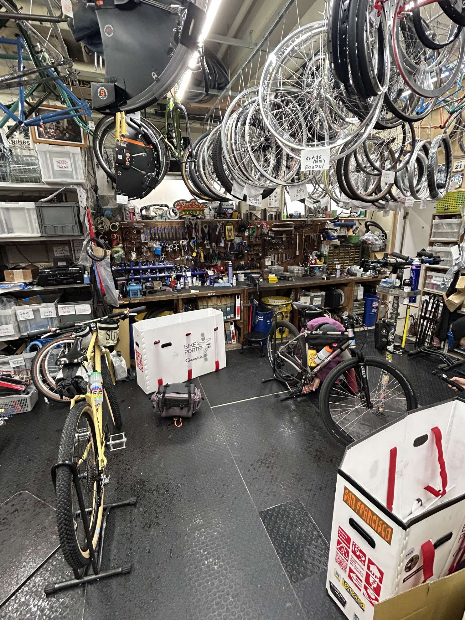 自転車持ってない人も多数来てくれるということで、僕セントさんMattとJimmyの4人でひたすら組み立て整備。