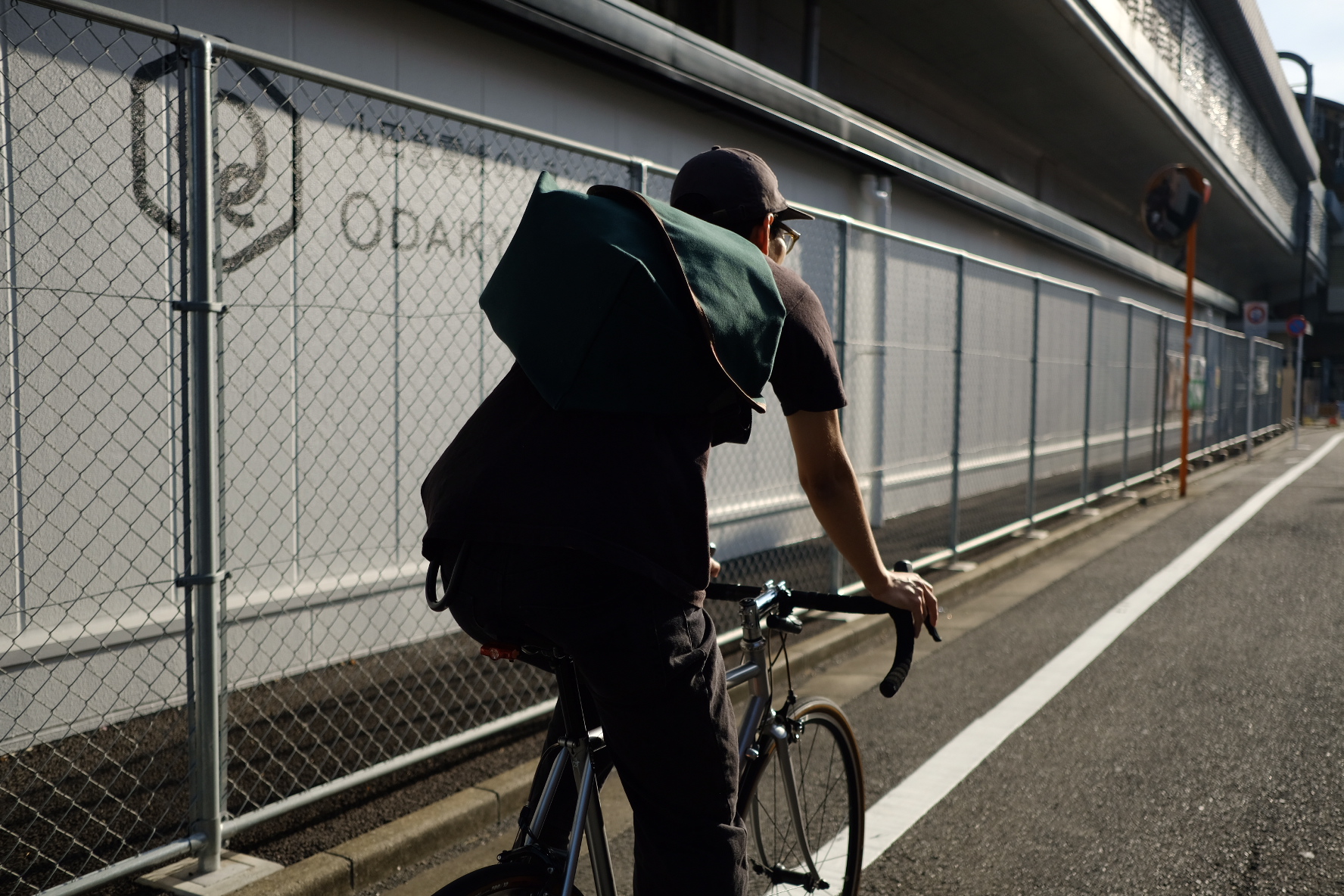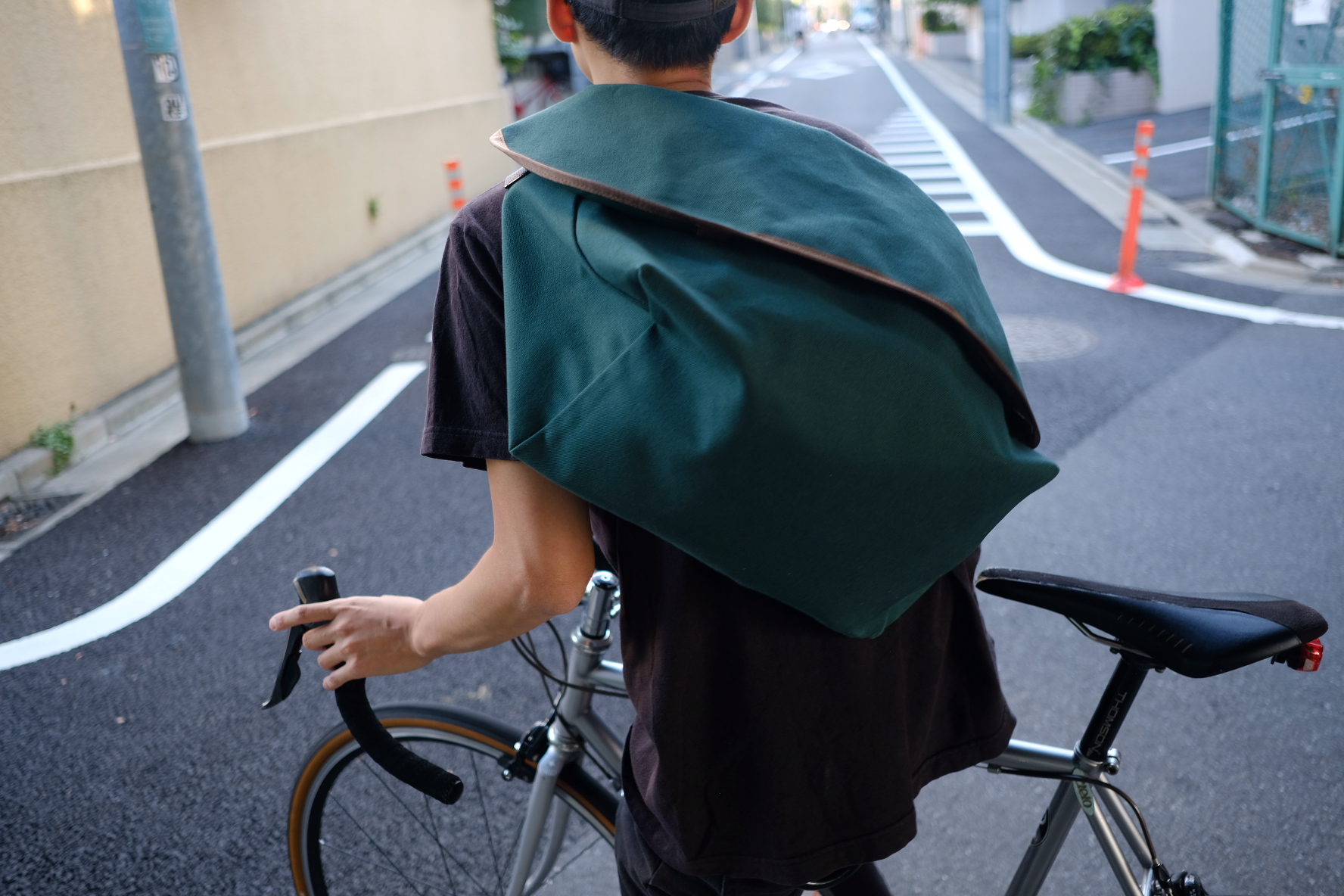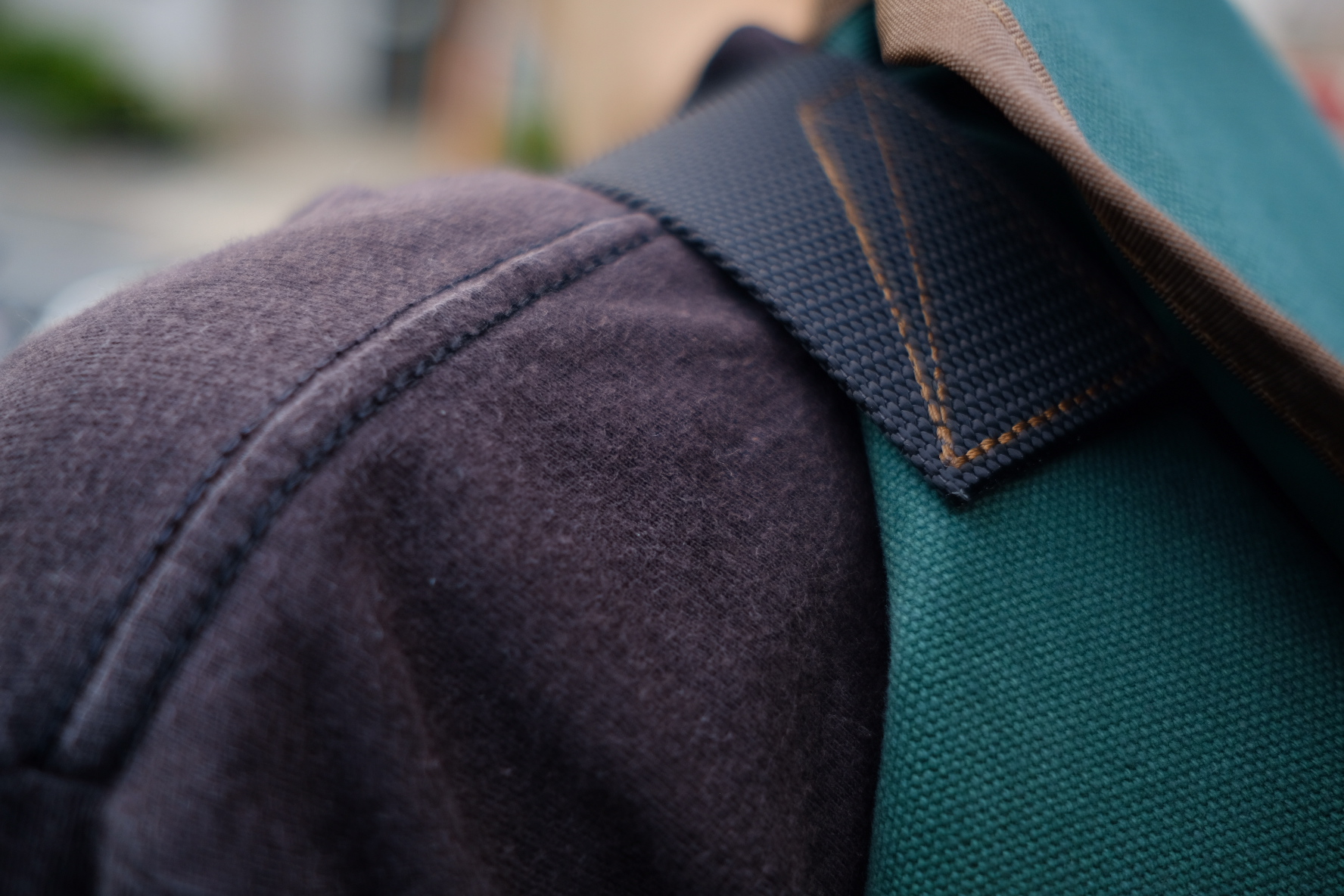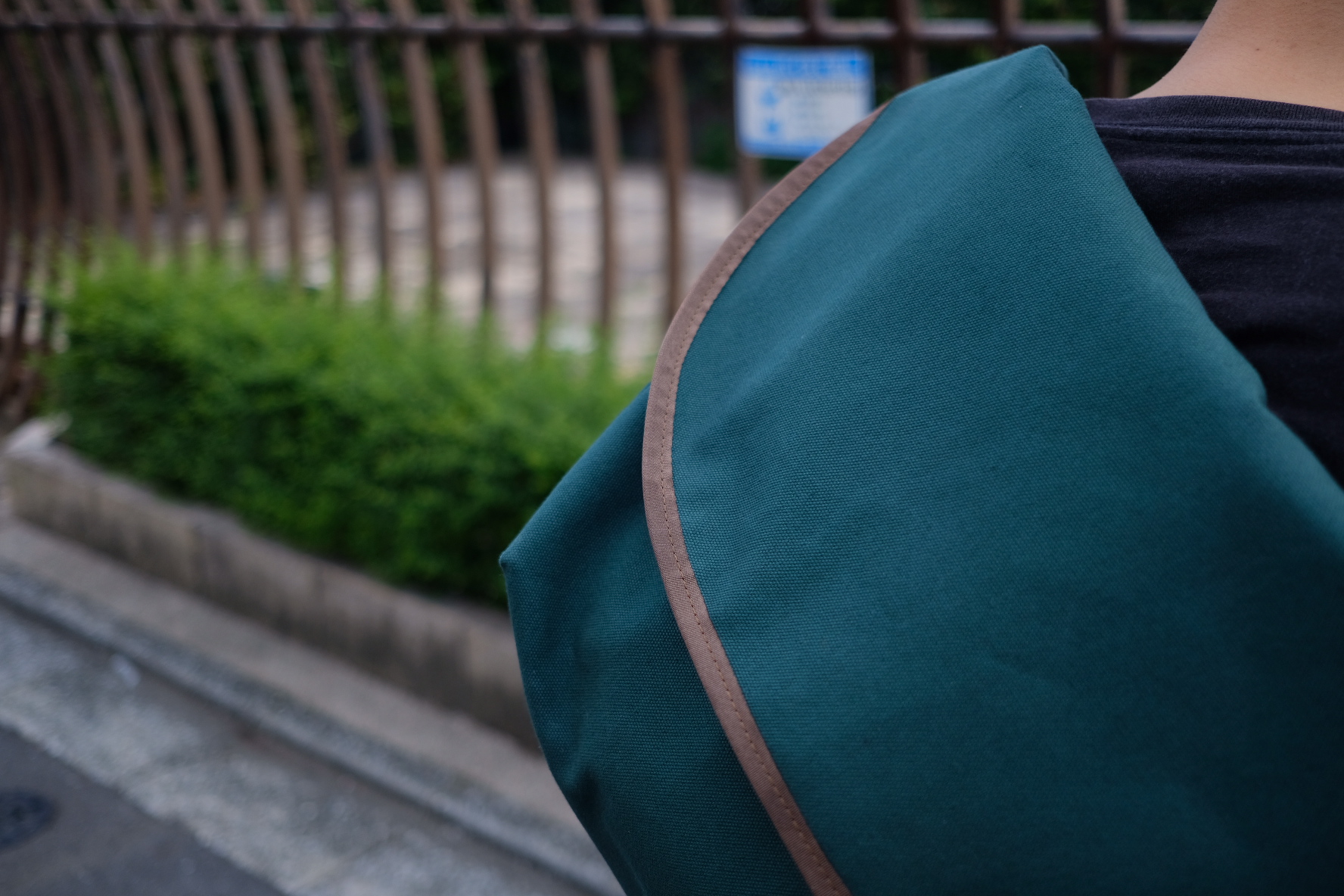 今回は撥水加工(water repellent)の生地を選びました。この生地はワックス・キャンバスとは違いますので、ワックス・キャンバスのオイリーな肌触りに抵抗のある方などはこの機会に背負って頂けたら嬉しいです。肌触りはサラッとしていて生地自体のコシが少な目なので初めから体に馴染みやすい生地です。