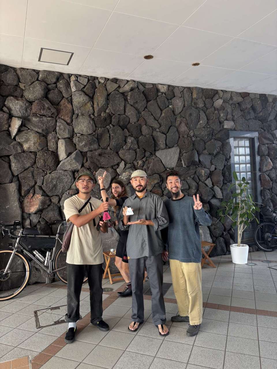 左からソーシャルライドでもお世話になったROCKPOINT COFFEEの店主である岩崎さん、BLUELUG KAGOSHIMA店のあぜみ師匠、そして親友のヒデがサプライズで来てくれた。