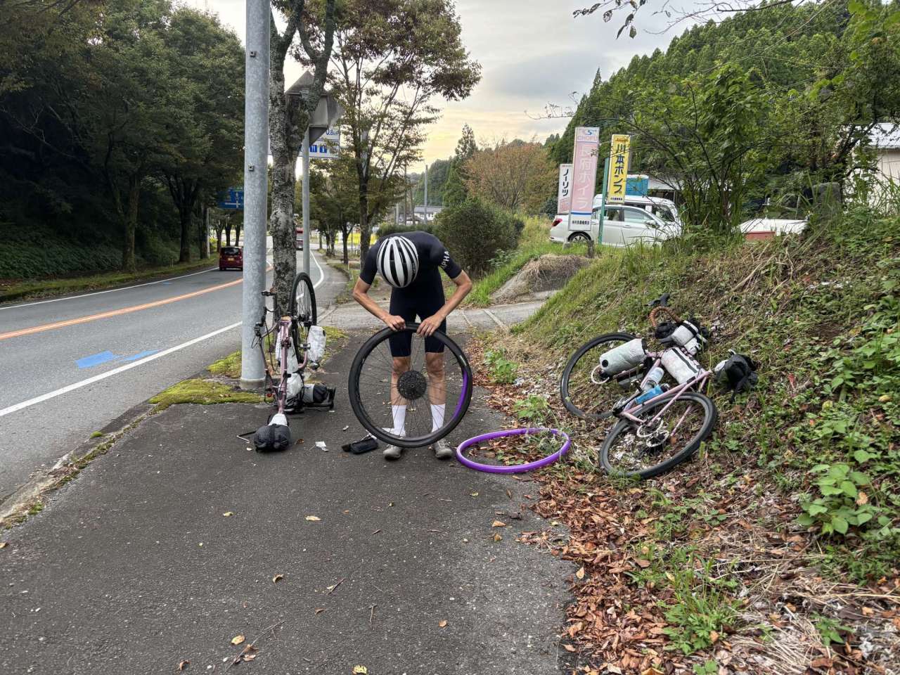 休憩を終えて、再出発するとすぐに健太君がパンクをしてしまうアクシデントが。(原因はガラスの破片だった)