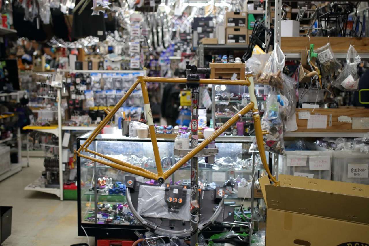 これから組み立ての、新Sam Hillborneのフレームをバイクラックにぶら下げて、退勤後のピットでモワモワと考え事してみました。