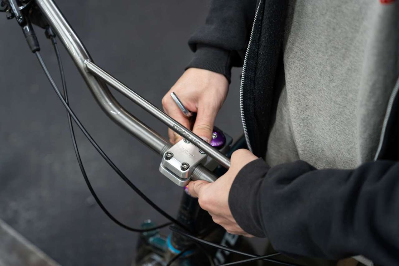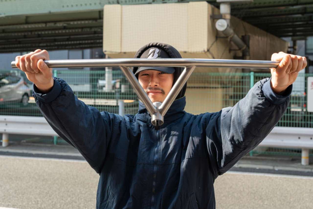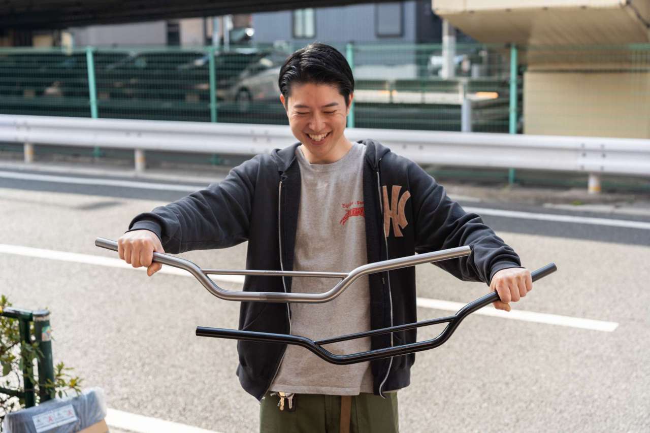 2ピースバーにしてはライズがやや浅く、補強のパイプは長めの特徴的な見た目と、グリップ部分のバックスウィープ・アップスウィープ加減が絶妙で「スチャ」っと手に馴染みます。