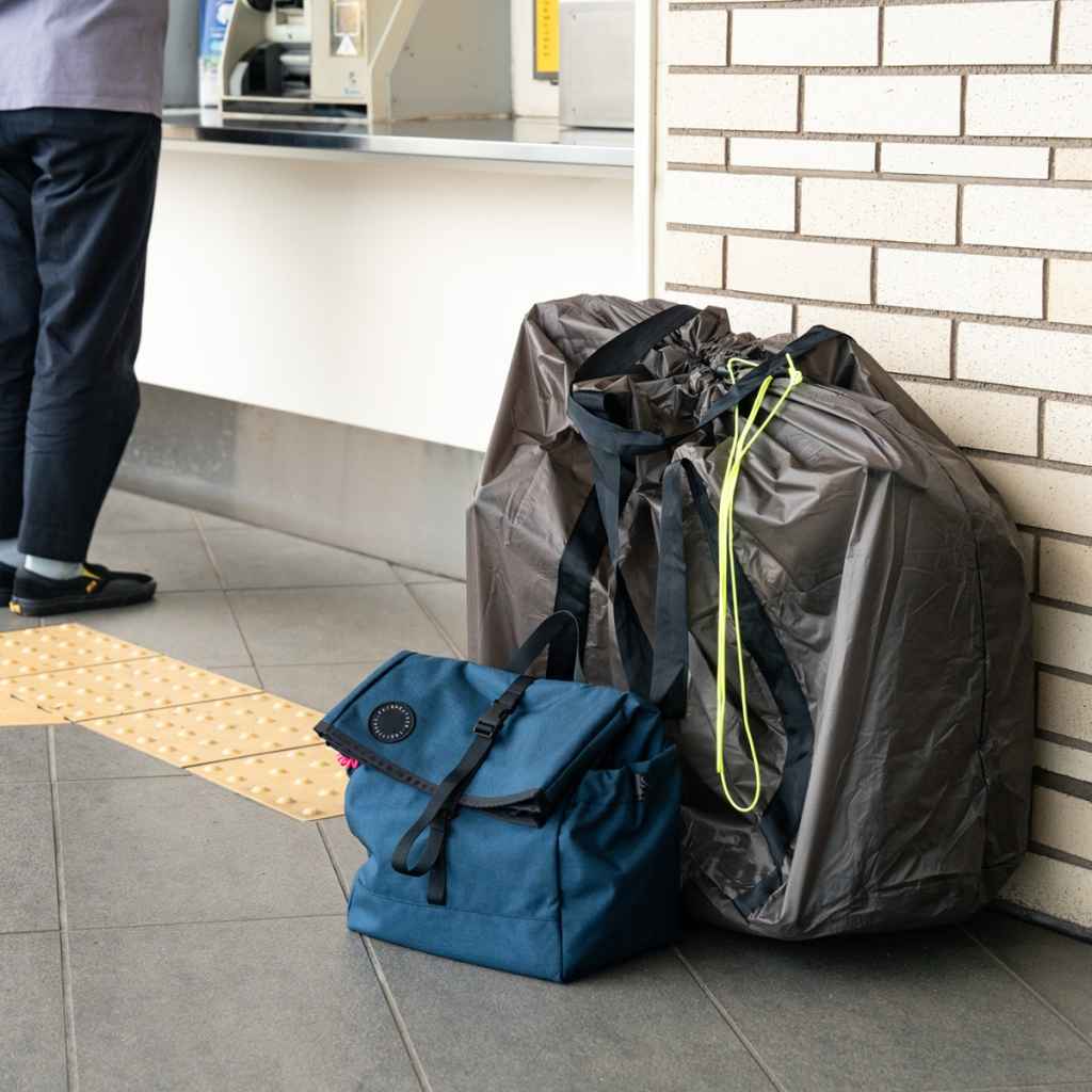 輪行時や、会社、お家に着いて素早くちゃちゃっと折りたたんだ後持ち運ぶ時にこのアイテムの出番。