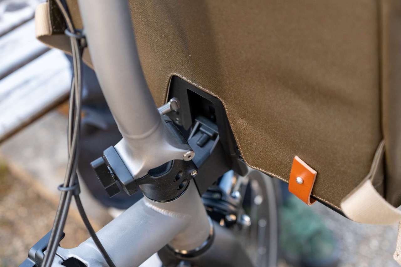 バッグ側にブロンプトンにつけられるフレームが付いていればワンタッチでつけ外しが可能。