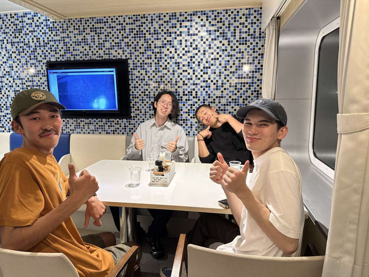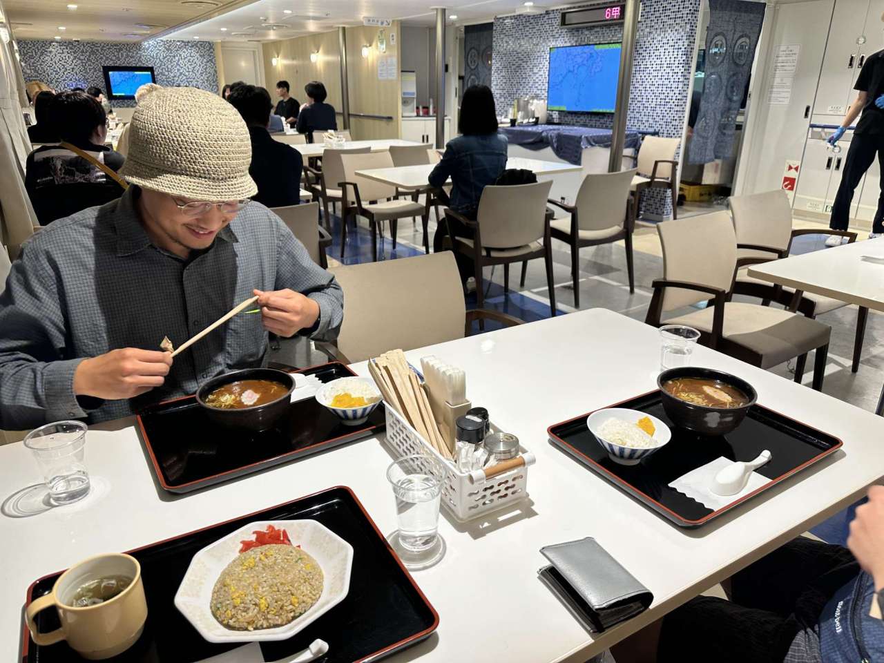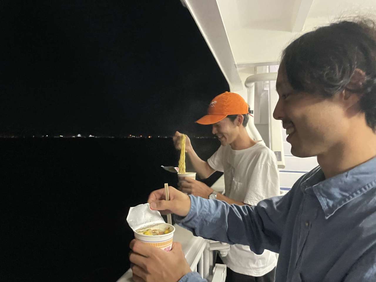 行列のレストランに並んで食事にありつきます。待ちきれなかった3人はデッキでカップラーメンを。