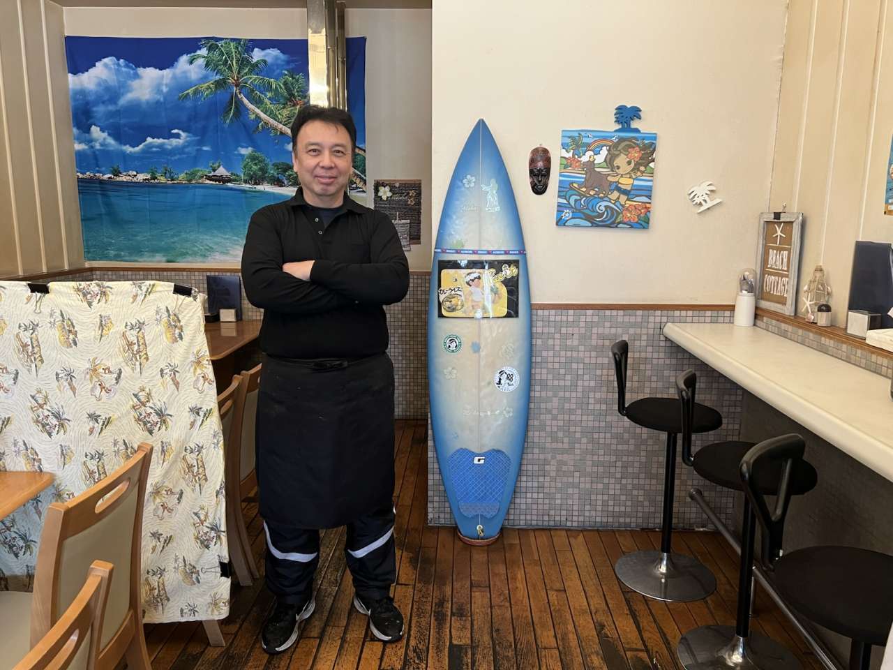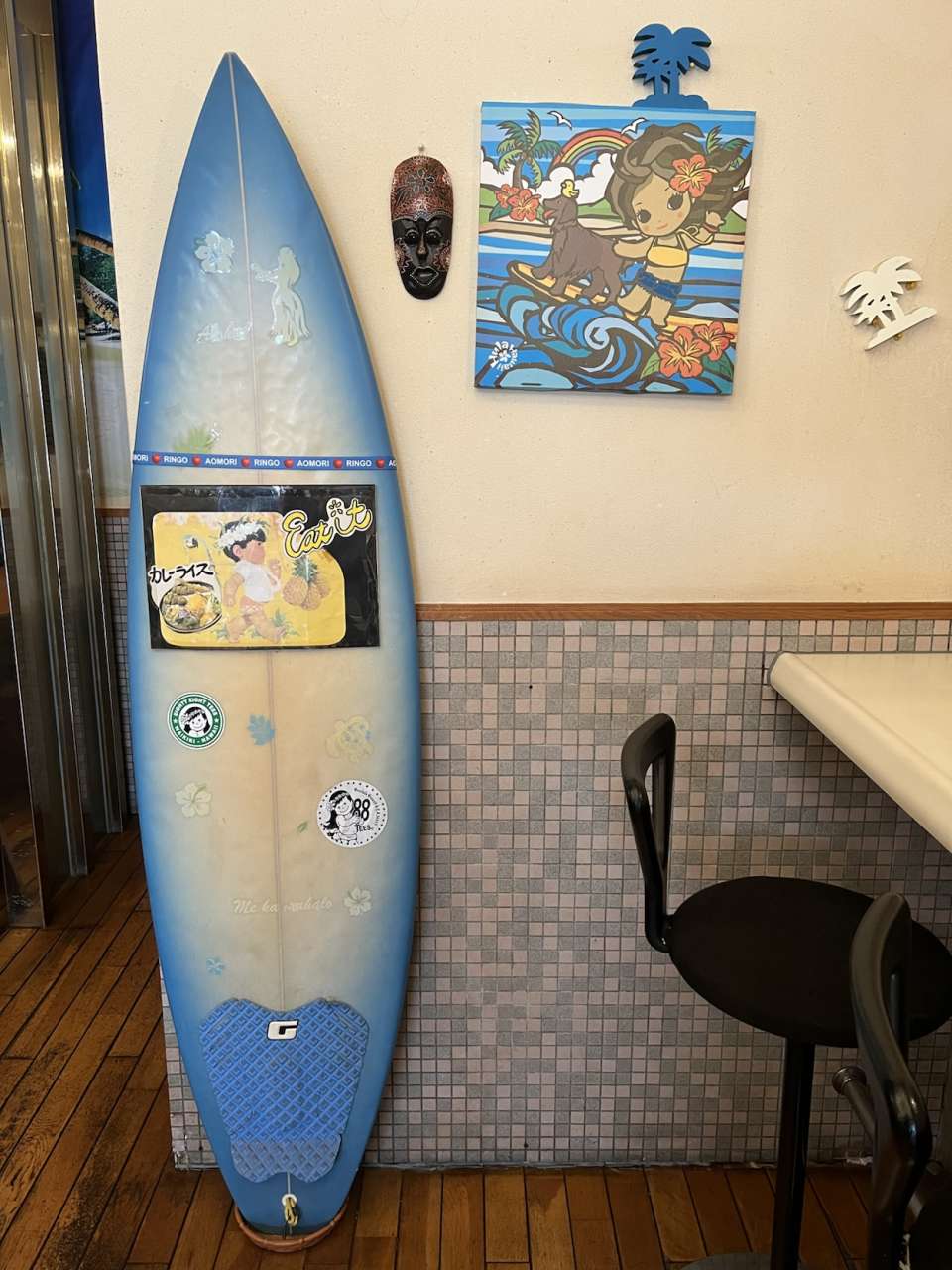 常連さんに譲って頂いた、サーフボードが店内のフォトスポット?