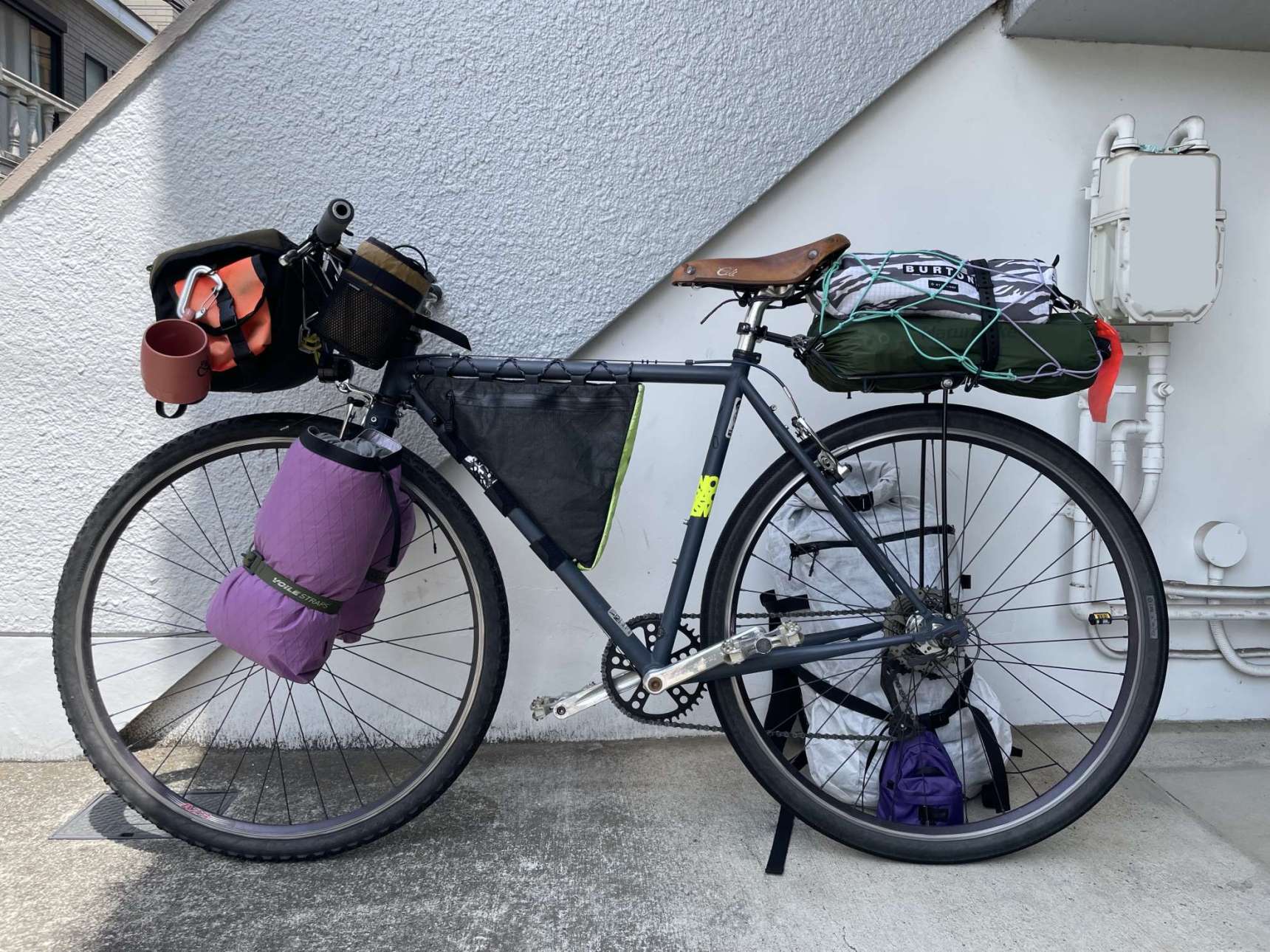 *WIDEFOOT* cargo mount classic × 16inchのVOILE × *FAIRWEATHER* dry sackでフォークベタ付けの簡易パニア