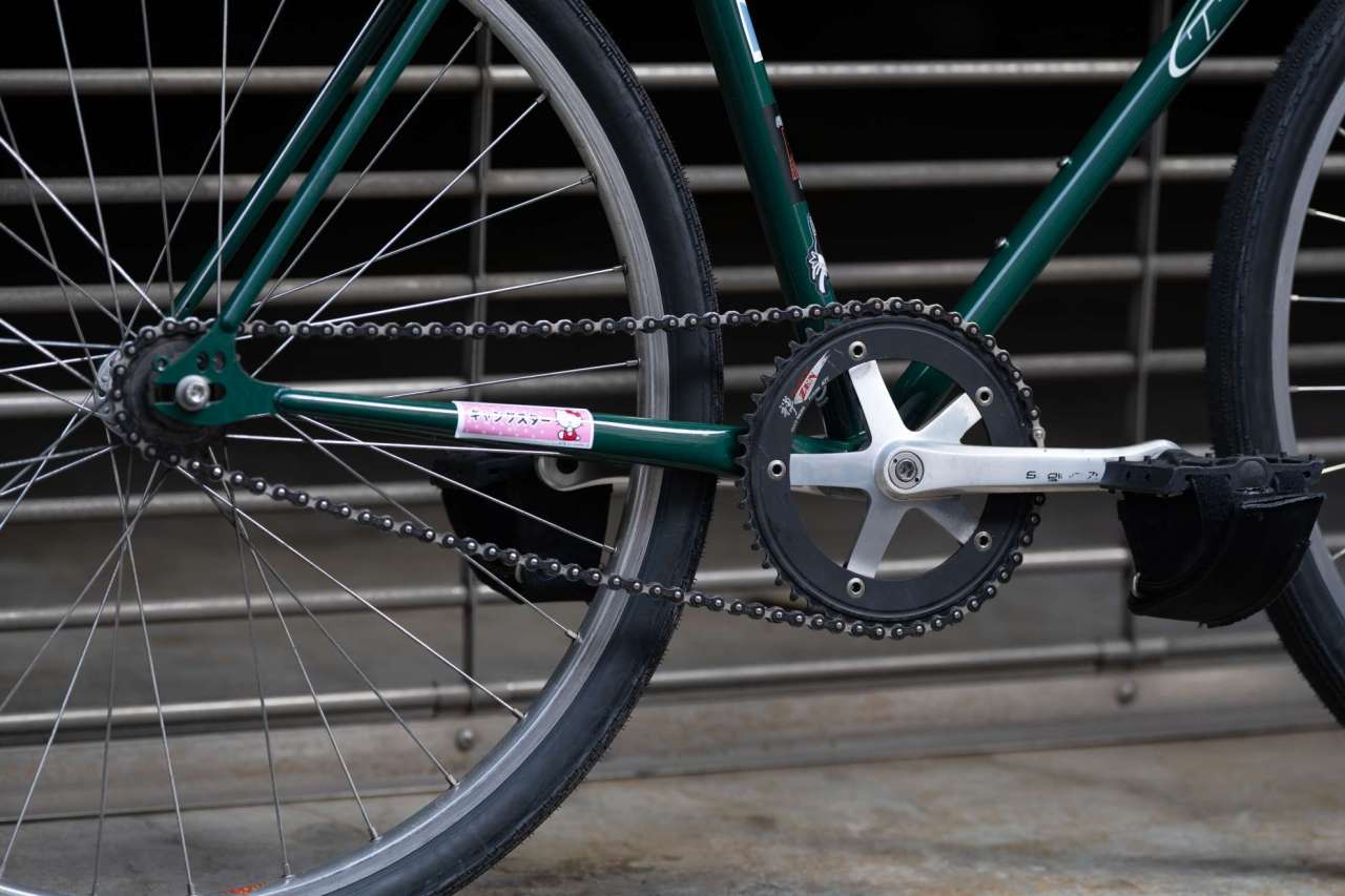 チェーンリングはSugino Zenで、コグはEuro Asia Superstar Track Cog。海外のトラックバイク好きっぽいセッティングにしてみたくて買った組み合わせ。これらもSteamrollerから使い回してるパーツたち。