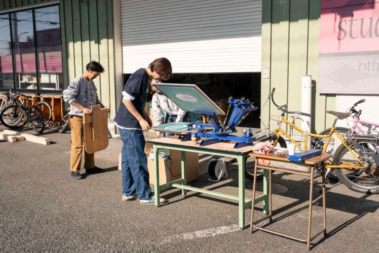 縫製チームには毎度無理言ってごめんなさい。なサンプル品などを多くご用意いただき、ご購入いただいた洋服やバッグにその場でシルクスクリーンプリントできます(できる製品とできない製品があります)