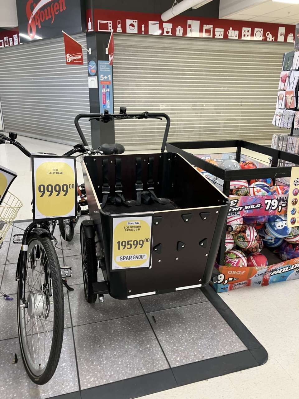 大きなスーパーで見かけたカーゴバイクは19599kr(約47万円)でした。