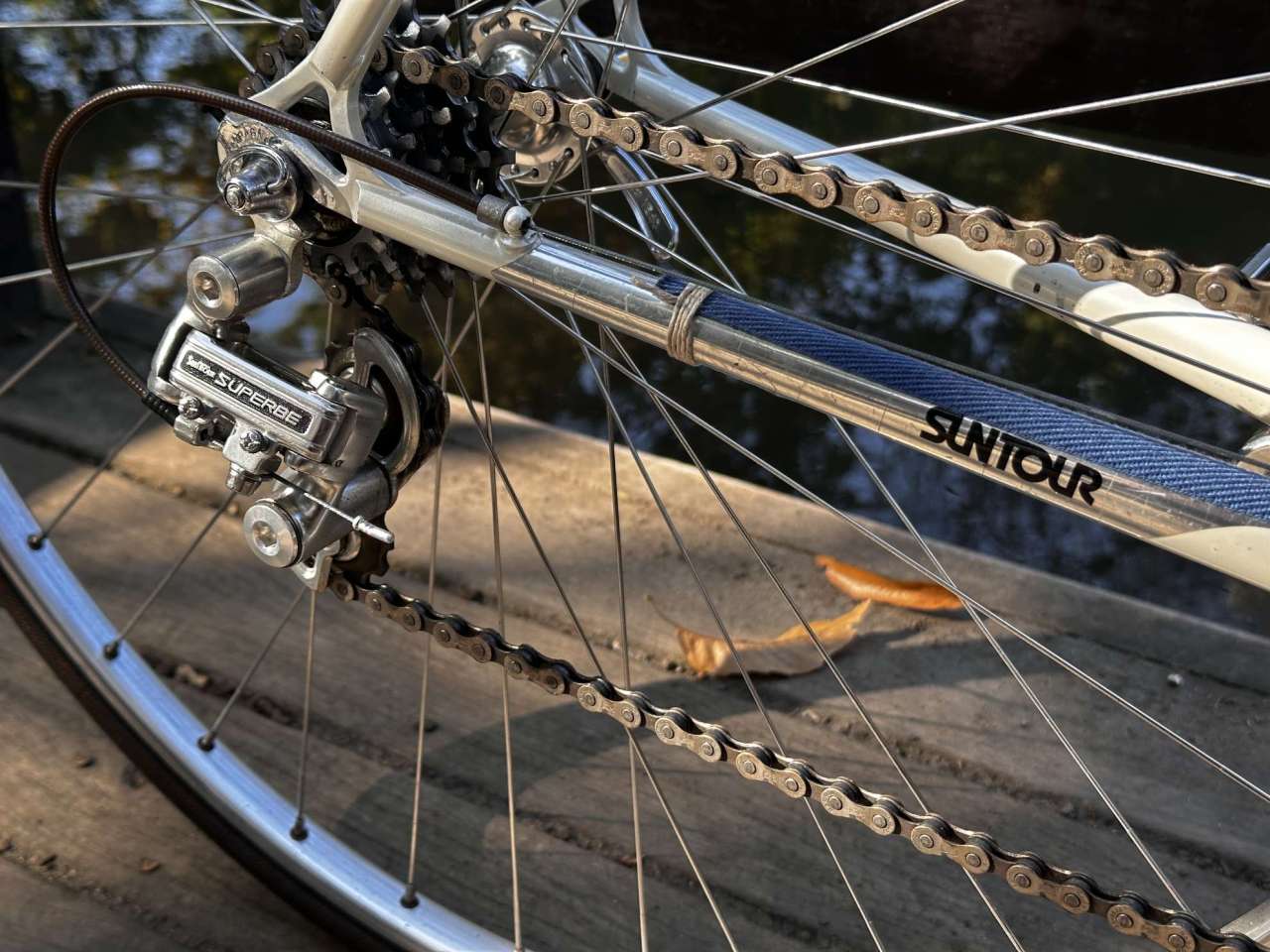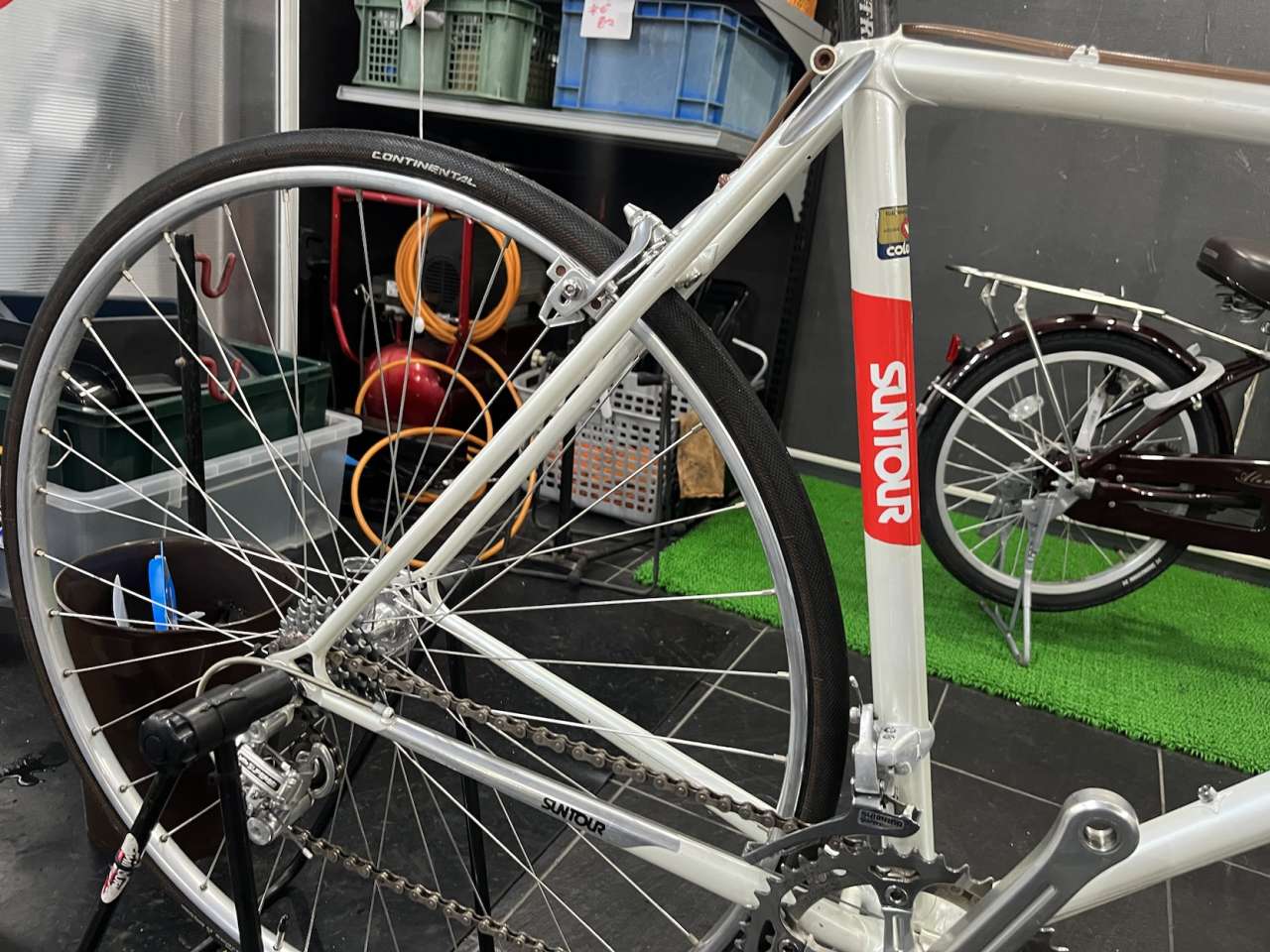 サンツアーのデカールが貼られていますが、サンツアーはコンポメーカーなので、このフレームは一体全体なんなのだろうね〜?と首を捻りながら購入。