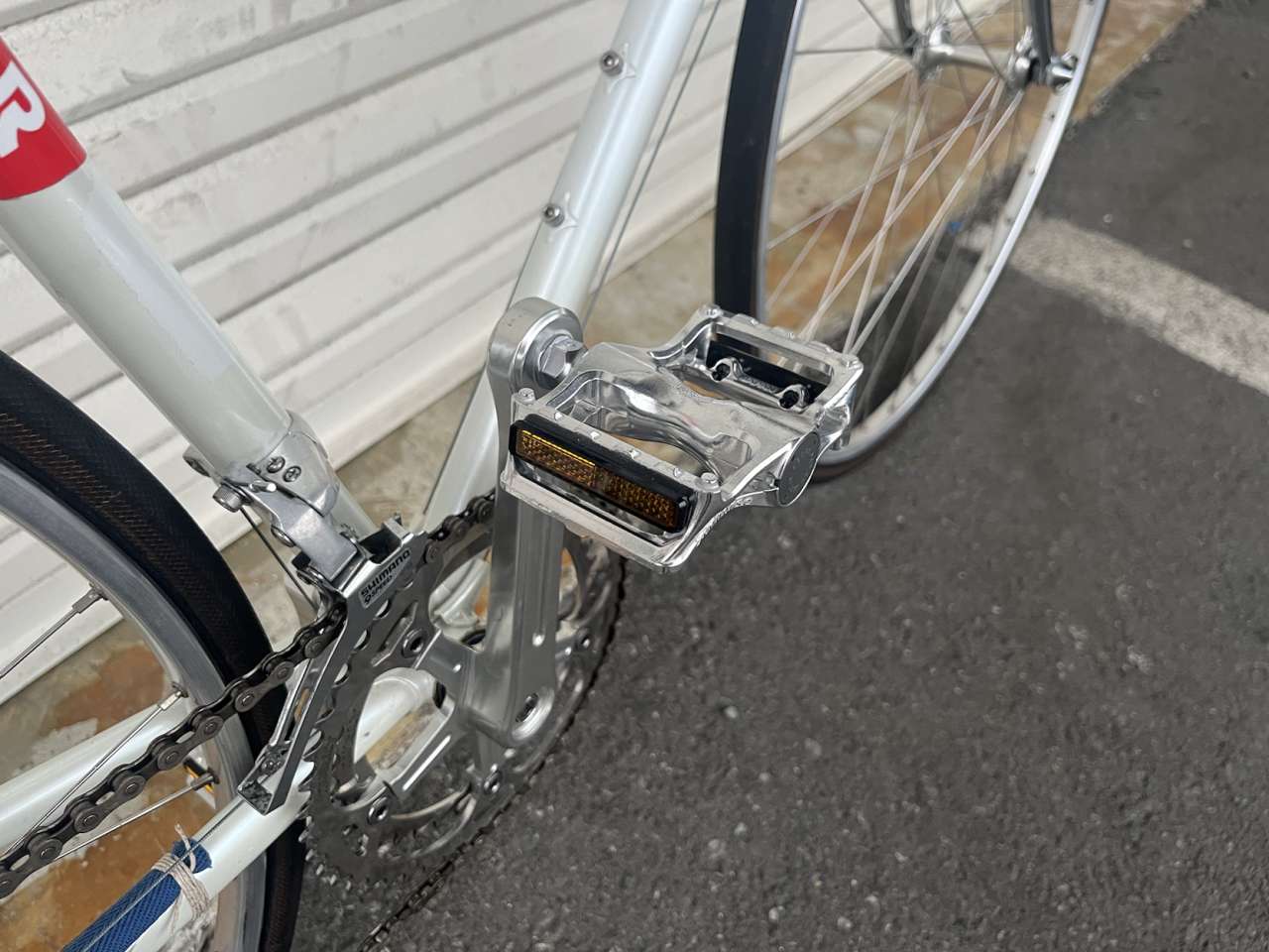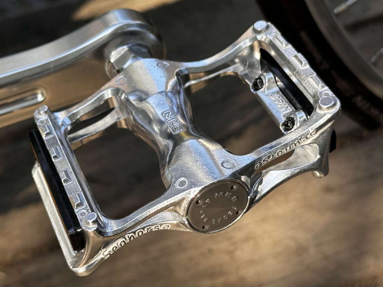 ペダルは、「この車体に抜群に合うのでは」と睨んでいたシーホースペダル。サイドのリフレクター(取り外し可能)も生活感があって好き。見た目以上に軽いし、踏み面も程よいサイズで街乗りに最適。ペダルストラップも通せます。