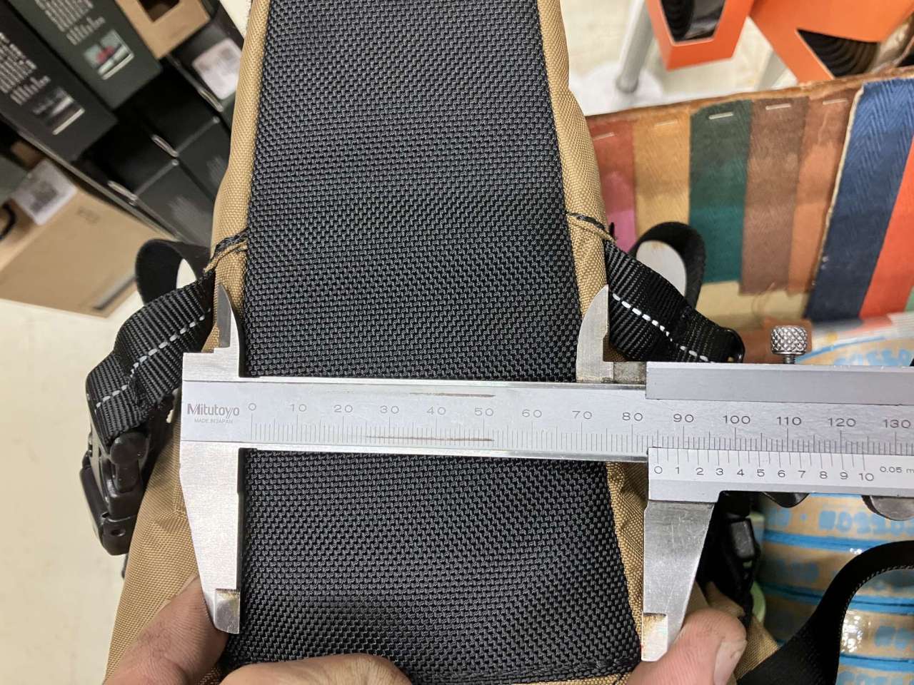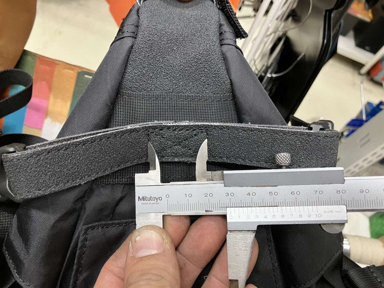 ぱっと見なんのこっちゃな①、他社製と比較してナイロンベルトがバッグに縫い付けられている物理的な幅が広いのです。
