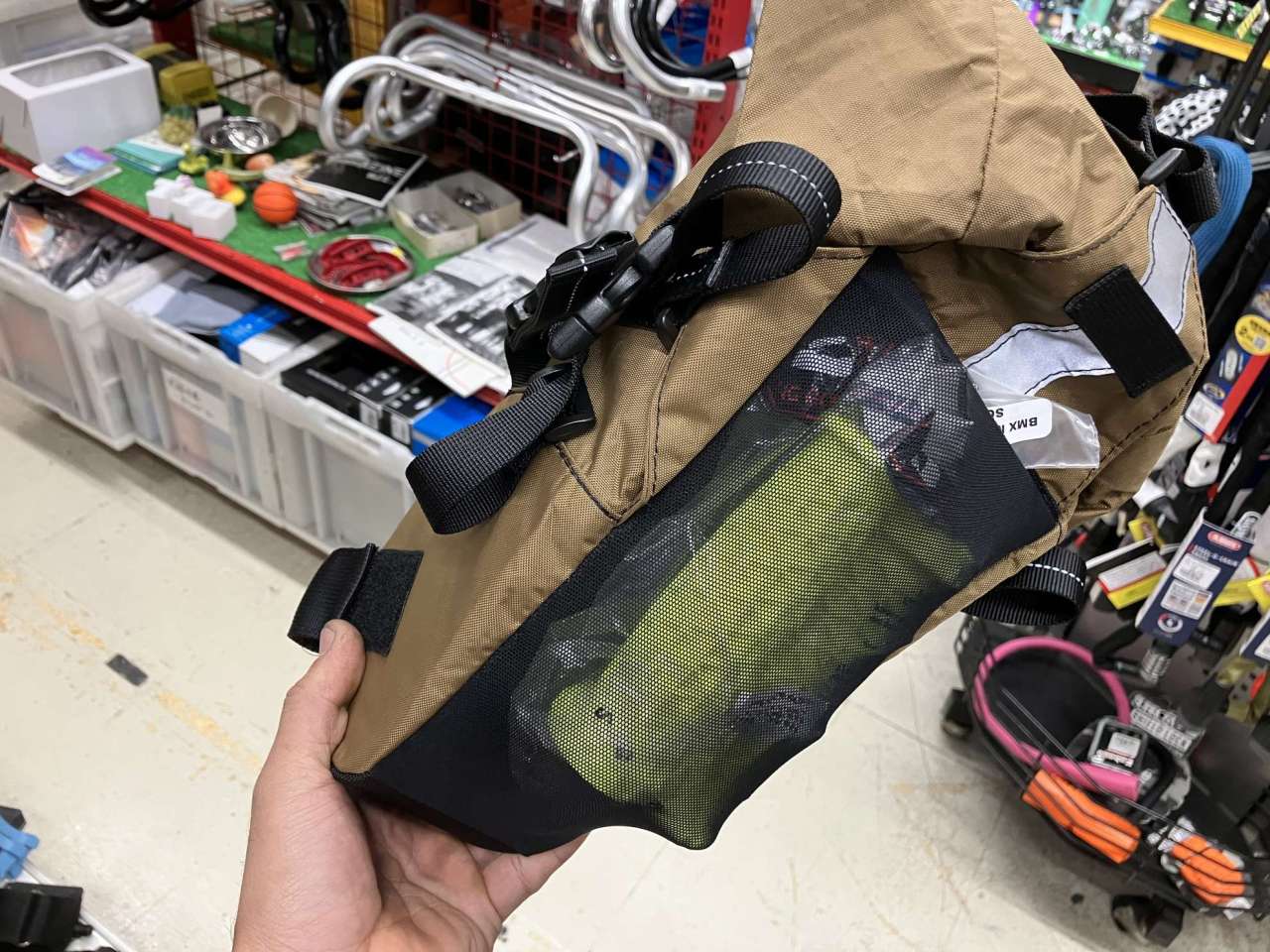 脱いだライトめなジャケットや道中食べた菓子パンのゴミなんかはここにグイッと入れて使っています。結構伸びるので見た目以上に容量アリです。