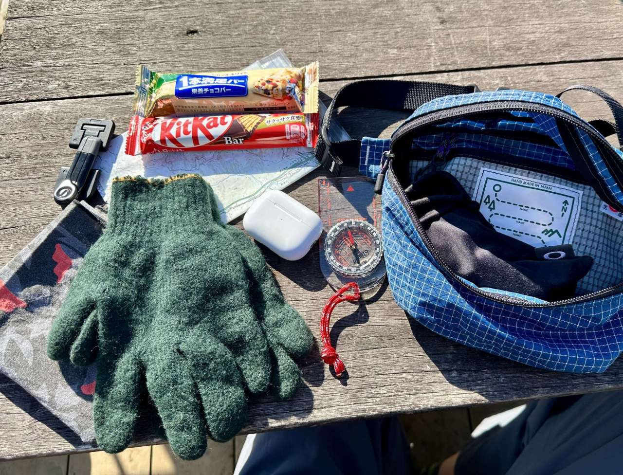 地図、スナック、ミニ三脚、バンダナ、グローブ、イヤホン、コンパス、サングラス。