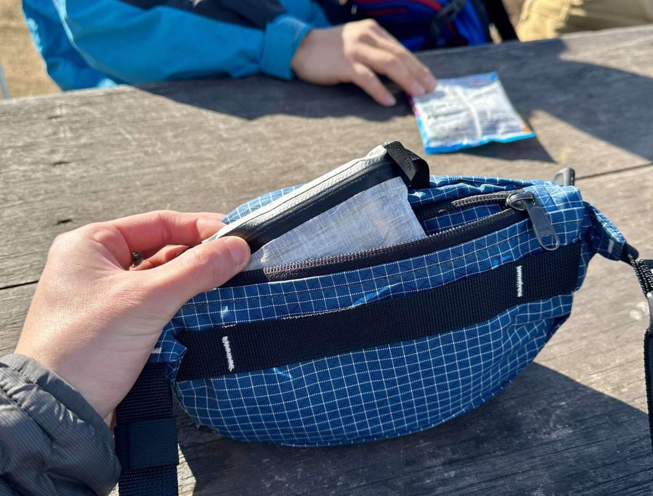こうやってウエストバッグのポケットに入れておくとじんわりと汗で濡れたりするのでダイニーマの防水性が安心材料。