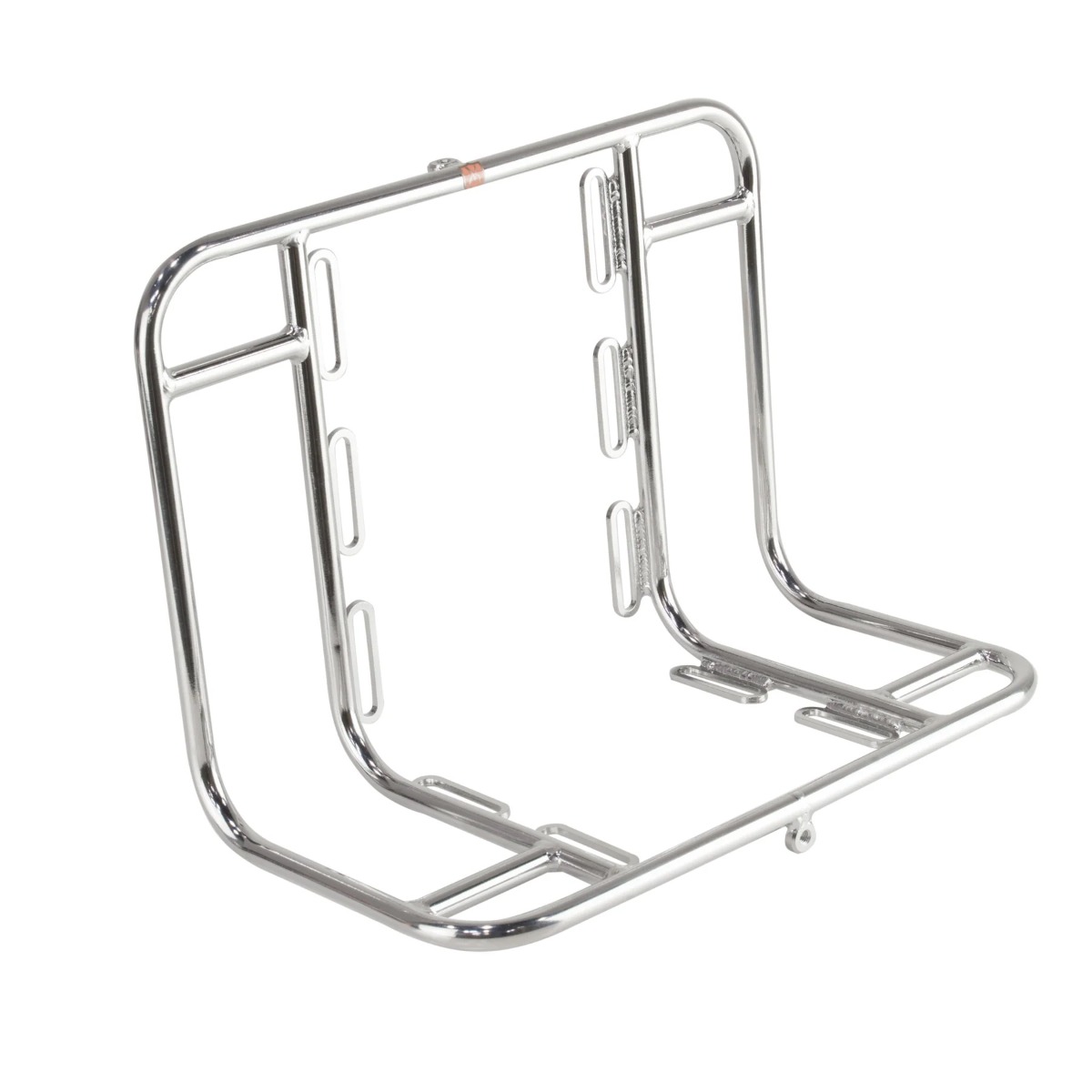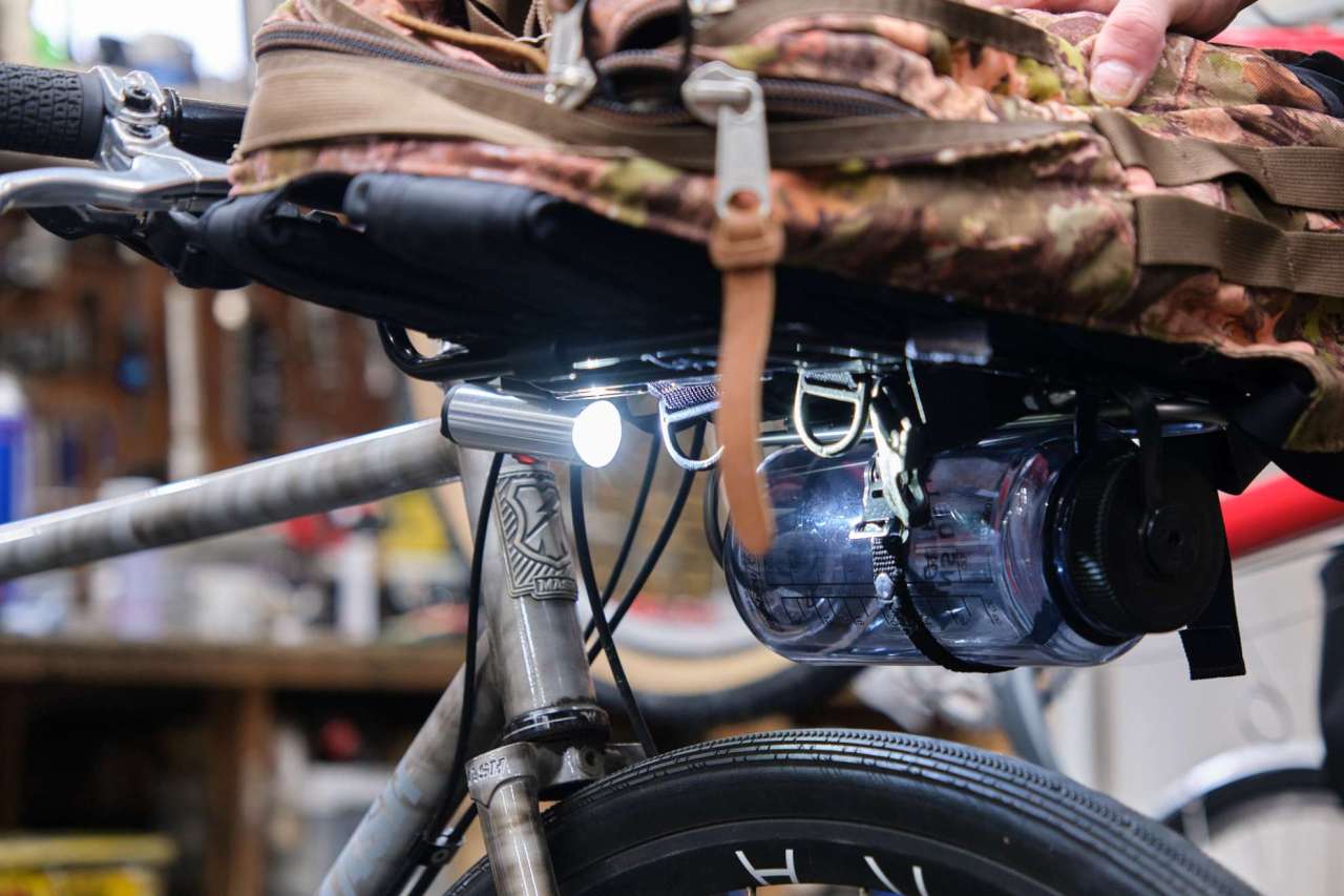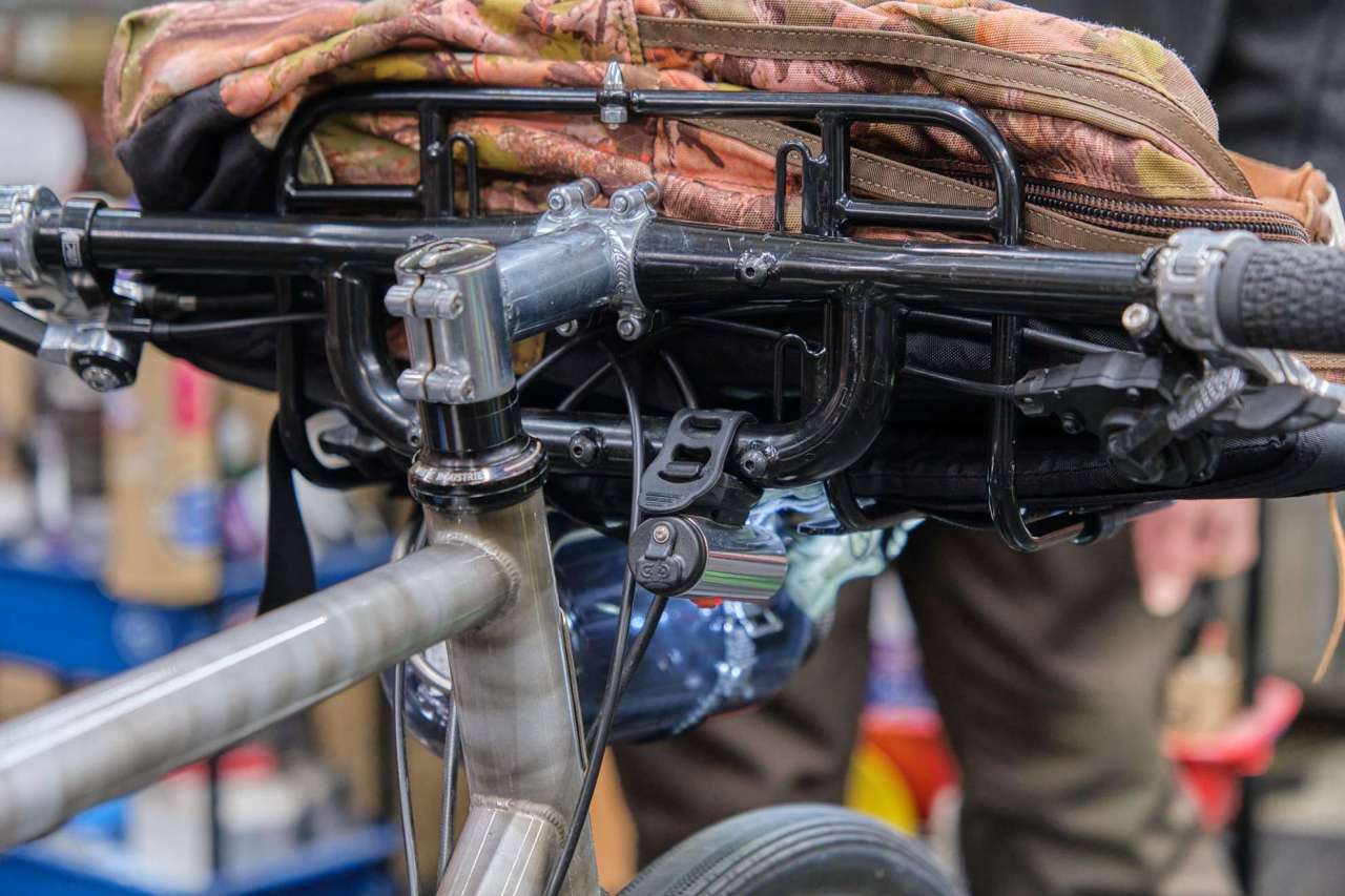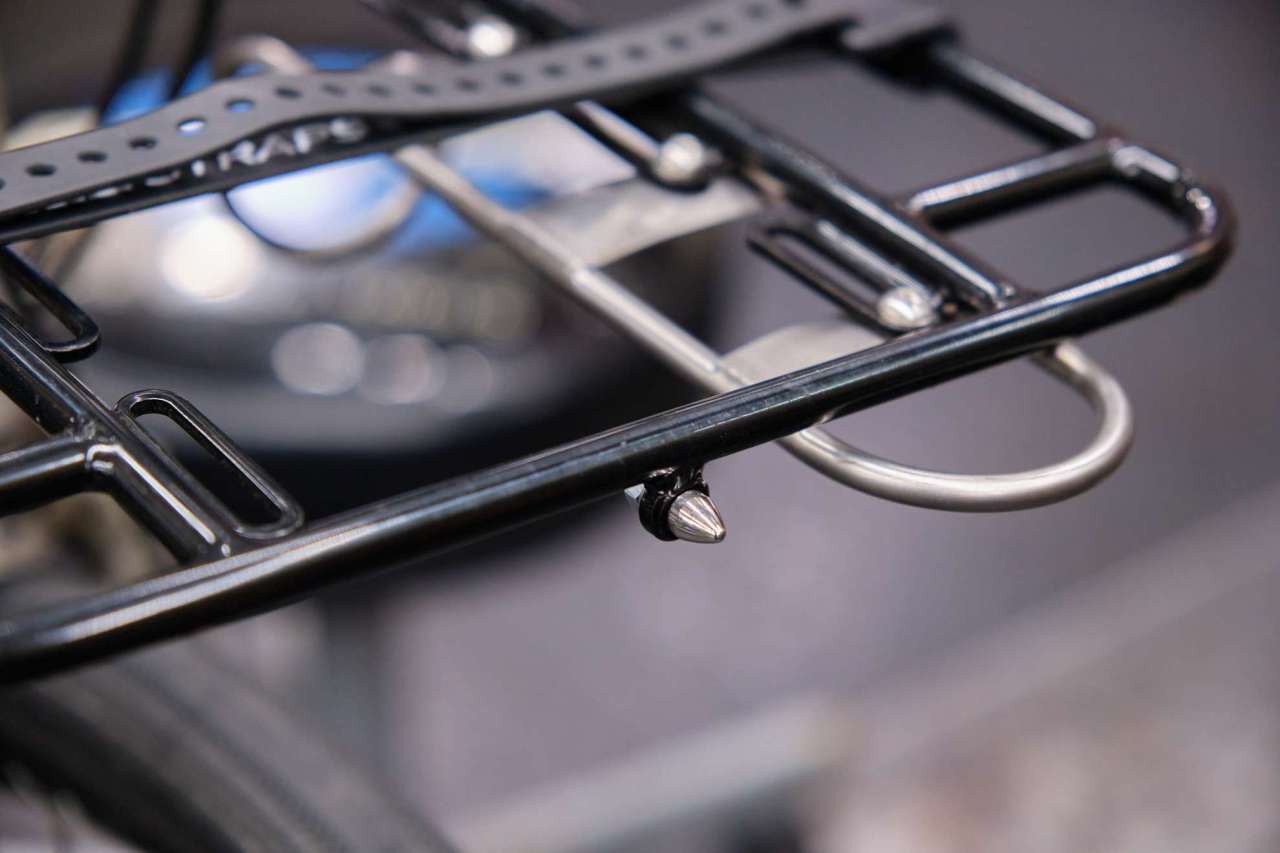 ハンドルバーに直接マウントするこのラックは、通常のラックよりも天板の位置が上に来るのも大きなポイント。ラック下部に積載してもフロントタイヤとの干渉が回避できます。