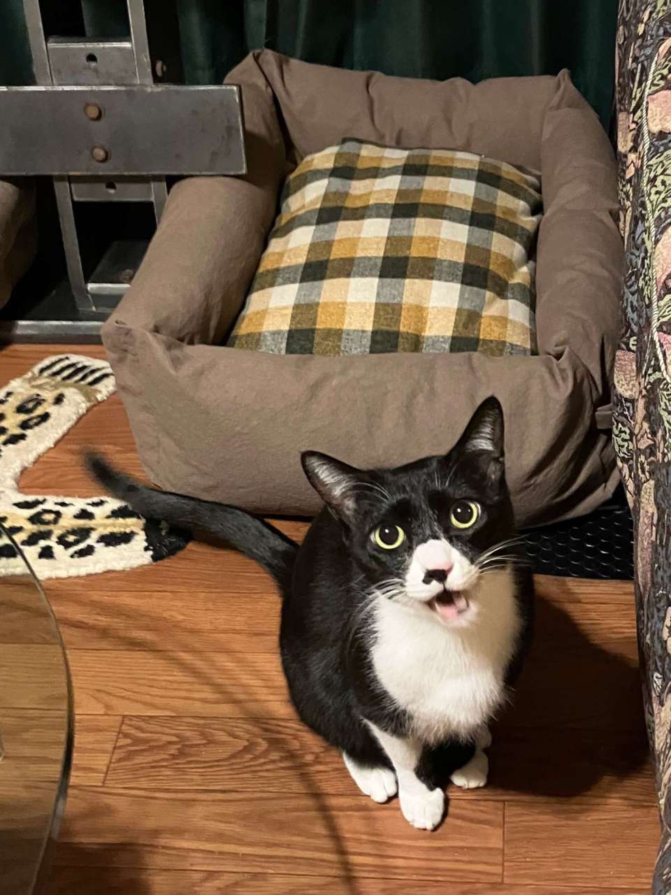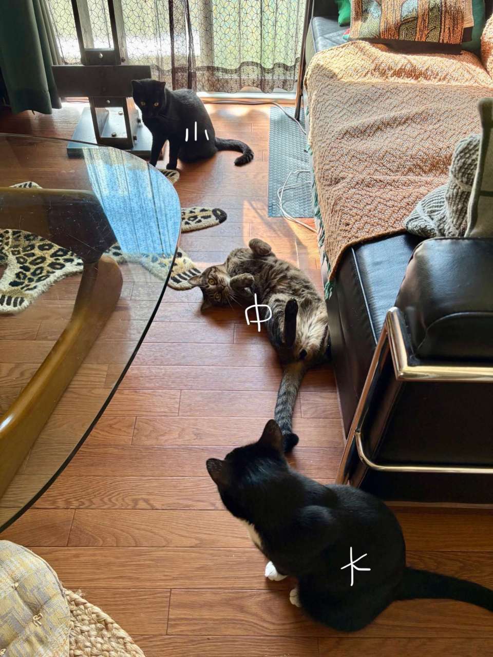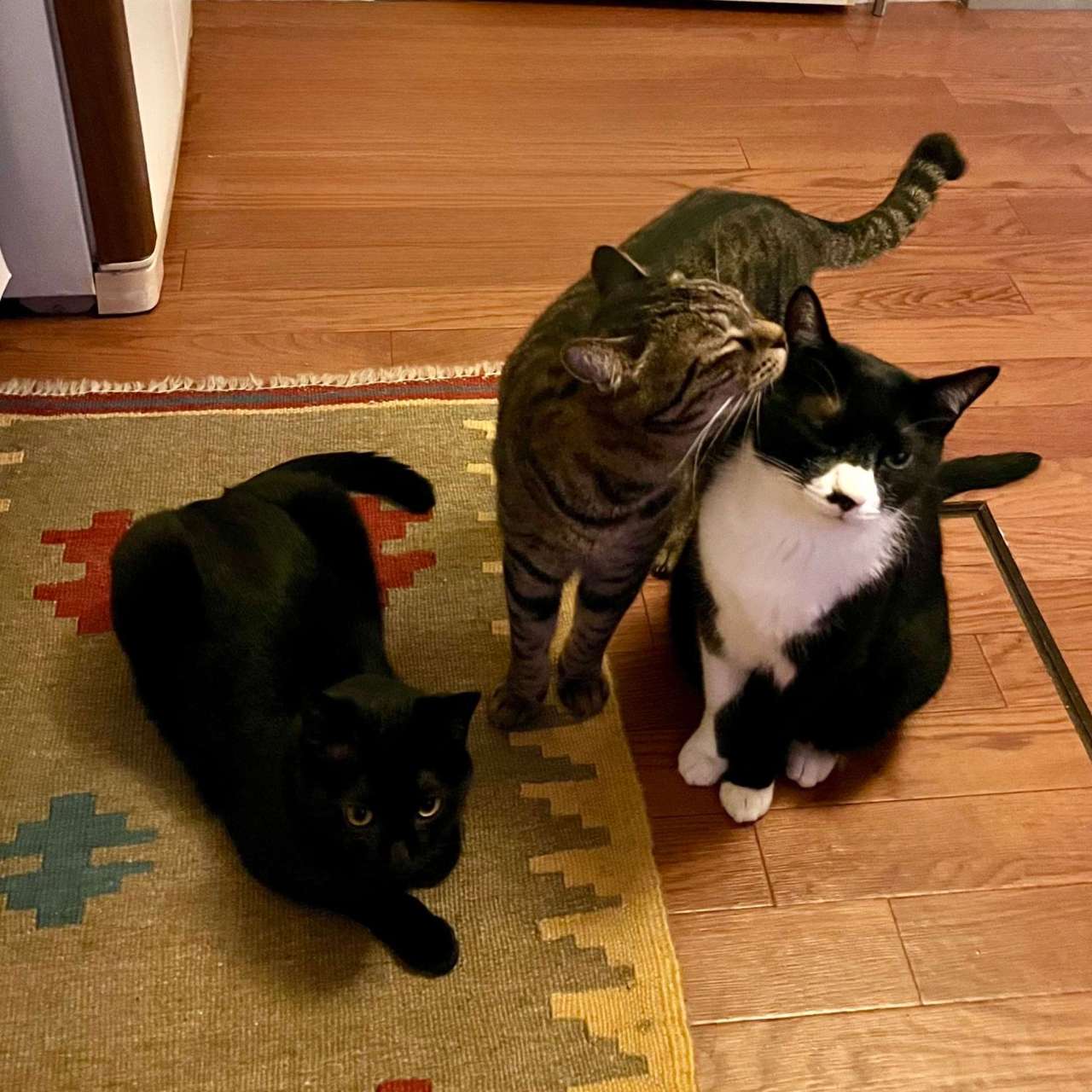 実家には3匹いて、体の大きさは大(黒白)、中(キジトラ)、小()な感じです。