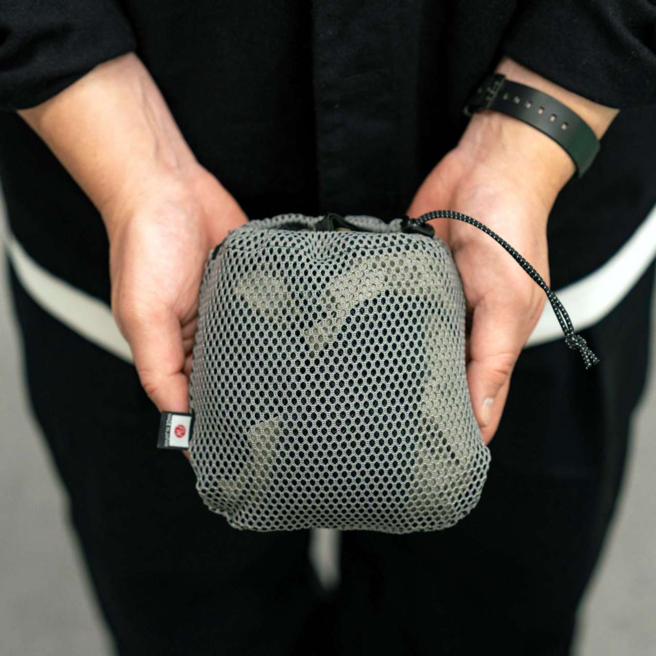 メッシュポケットのサイドには調整ゴム付き。絞ればお辞儀をしても中身が落ちてきません。