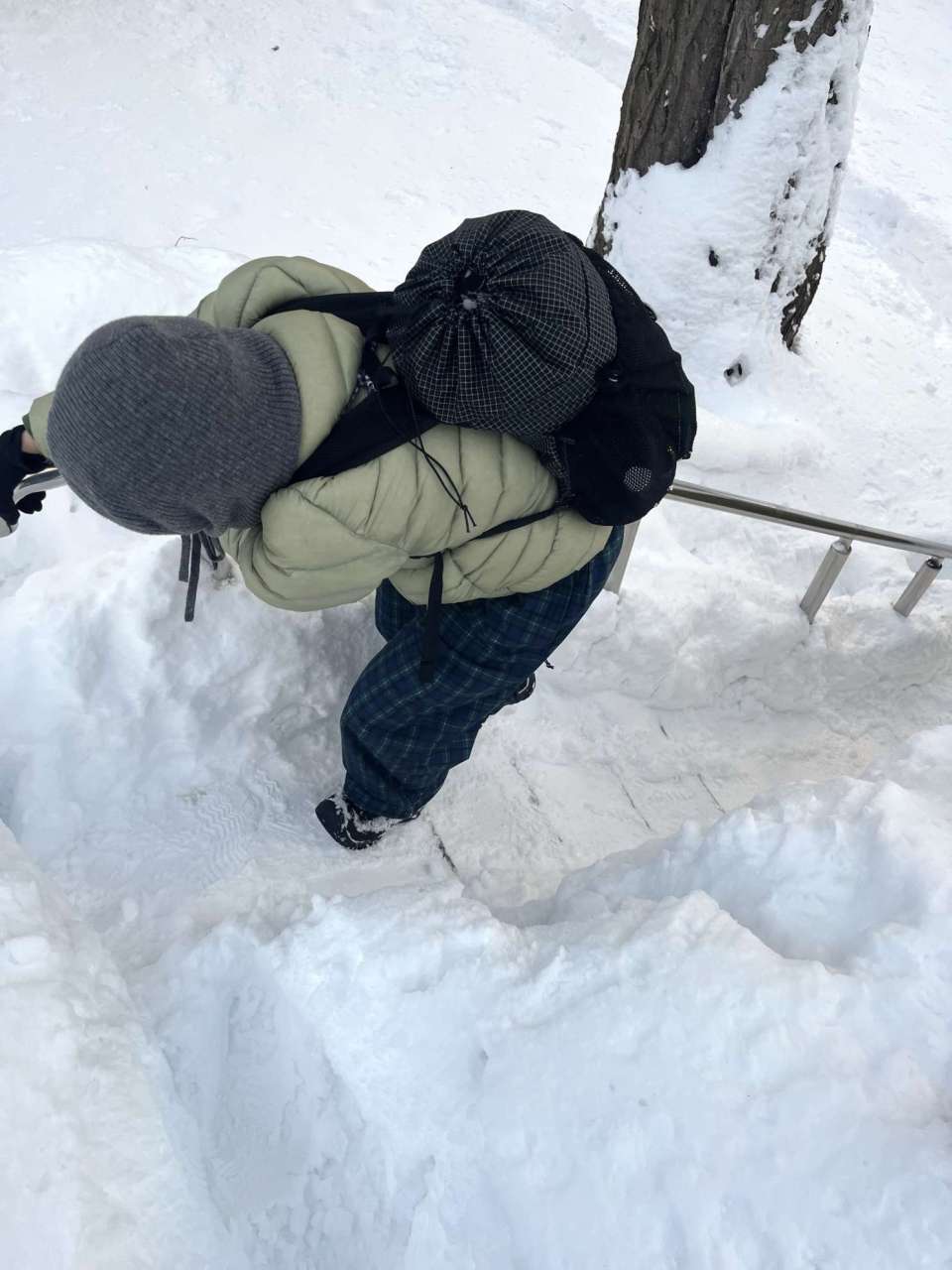 雪で階段が埋まっていても両手使えるし、見た目よりもかなり入るのでついつい買ってしまうお土産も問題なしです。