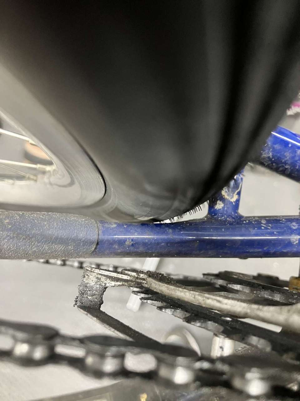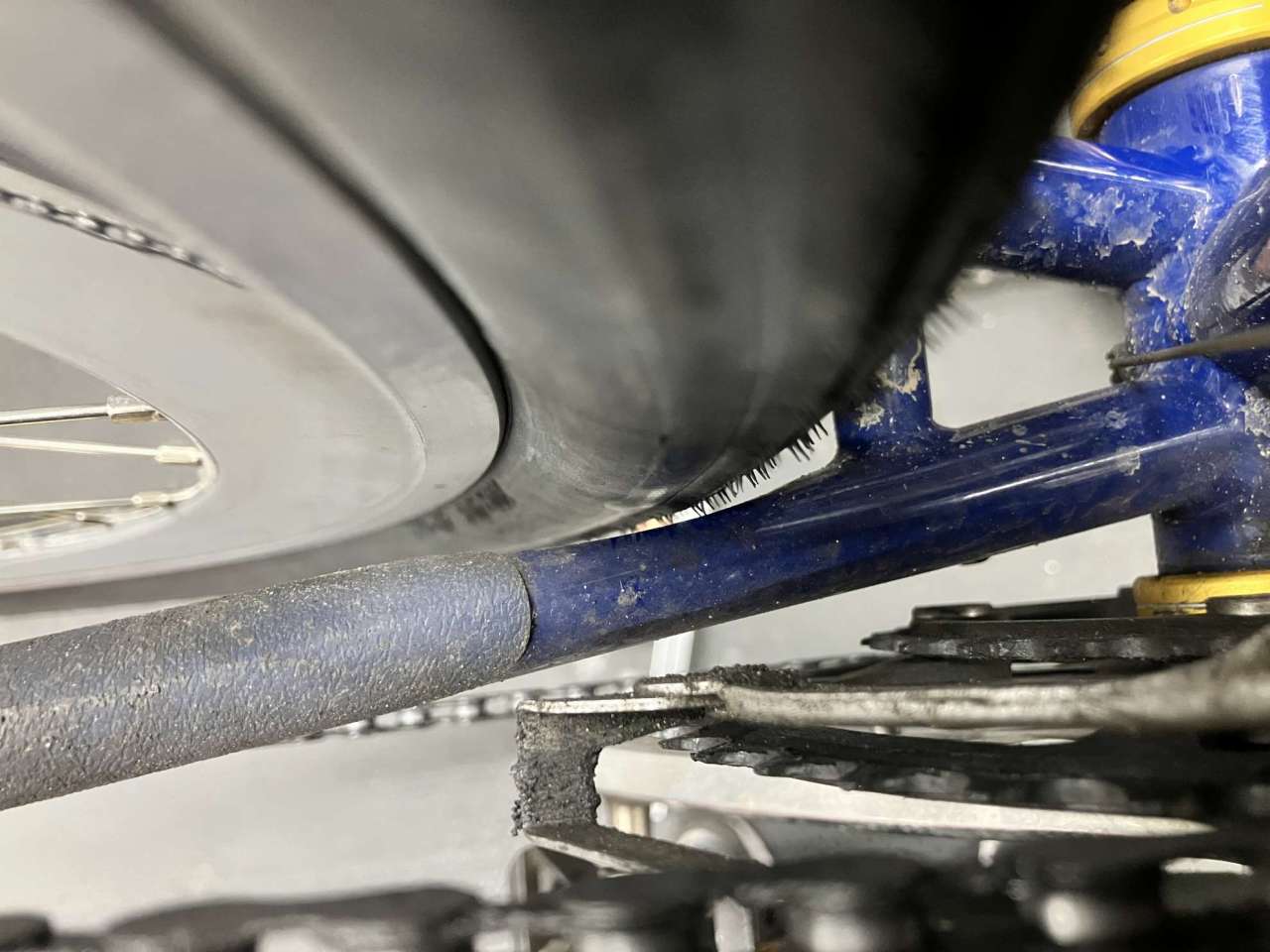 チェーンステー側もこれでようやくクリアランスが生まれ、車輪が一応は回るようになりました。