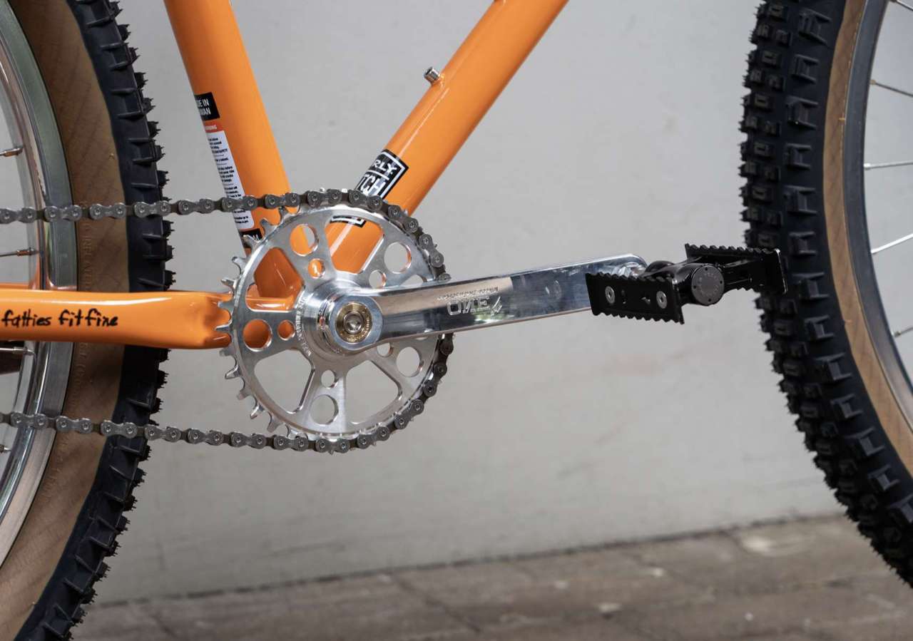 太いタイヤを取り付けるマウテンバイクに合うよう、もうひと種類のクランクアームと比較して左右のペダル間の距離が広くとられています。
