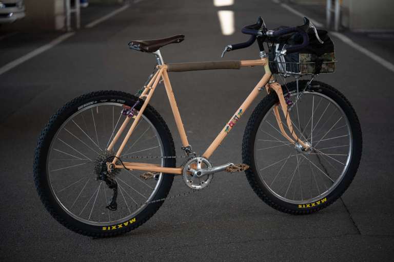 幅広のドロップハンドルにバスケットと27.5×2.8の目一杯太いタイヤがこのバイクの骨子。