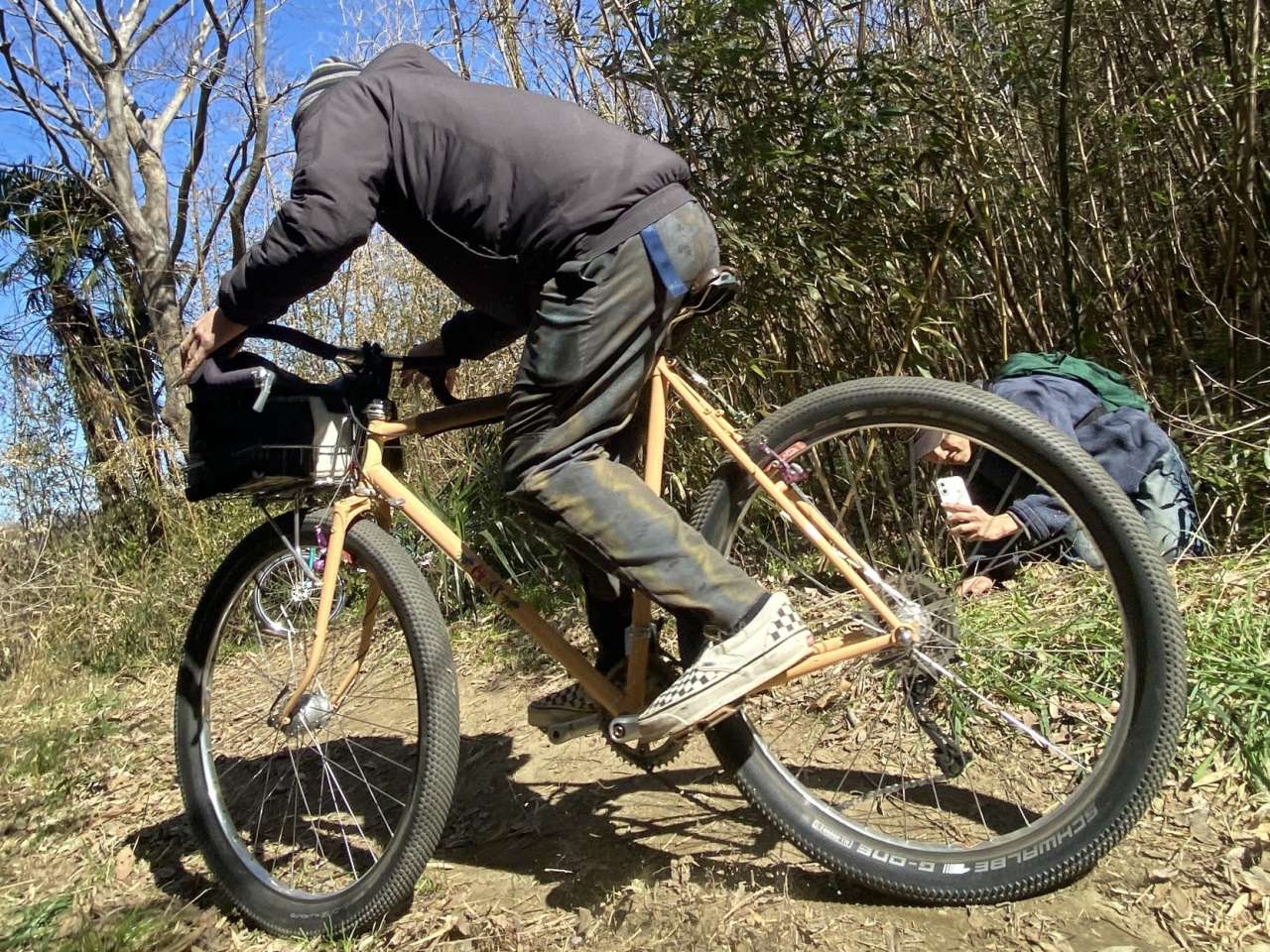 ブロックが小さくて軽量なSchwalbe G-ONE27.5×2.8、さらにAmazonで買った軽量TPUチューブをインストール。(車体撮影時はMAXXISでした)