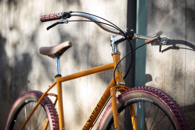 タイヤに合わせた綺麗なバーガンディのグリップはBrooksのもの。