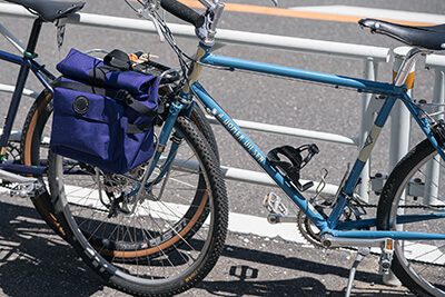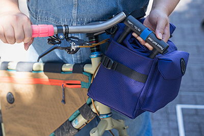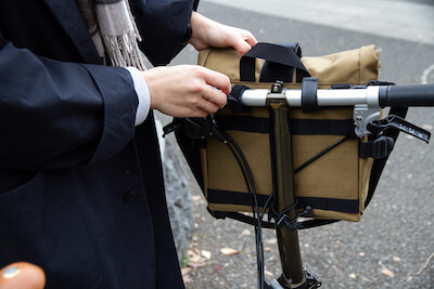 両サイドのポケットには水捌け穴があり、U字ロックやスマートフォンの収納に。正面にはマチが確保されたフラップ付きポケットが1つ。貴重品などクイックに取り出したいものはここに収納するのがおすすめです。 ハンドルへの取り付けはベルクロ2点とショックコード1点、計3点で固定し着脱しやすいベルトの作りになっています。 小径車はもちろん条件を満たせばその他の自転車にも取り付け可能。ハンドル下からタイヤまでのクリアランスが25cm以上必要です。
