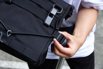 メインコンパートメントはロールトップで出し入れがし易く、荷物の量に応じて最大12Lまで拡張可能。出先で荷物が増えても安心です。 ボディの表地は耐久性に優れた1000デニールコーデュラ、裏地に防水フィルムがラミネートされたリップストップナイロンを使用。
