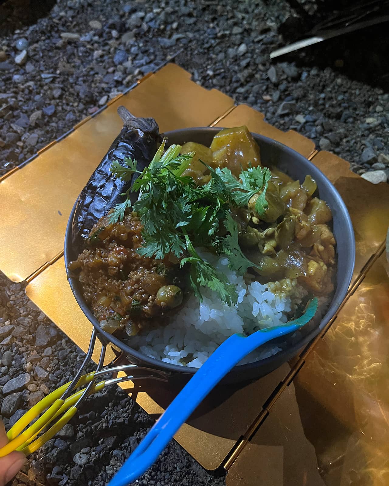 - 今回でキャンプライド2回目な若輩者で知識やノウハウ全くないながらテーマである美味しいものを作る為の食材を多く運べるように荷物は余計なものは持たず少なめで挑みました。フロントバッグ、左右パニアの装備でしたが片方のパニアは空の状態だったので、野菜収穫後、買い出し後でもまだ余裕があり。 As a beginner, and this only being my 2nd time doing a camp ride, I tried to bring as less as I can, so that there’s a lot of space to carry fresh harvested vegetables, which was the main theme for this ride. Went with a front bag and two panniers. Because I brought an empty pannier on one side, I still had some room after putting those veggies and other goodies we bought.