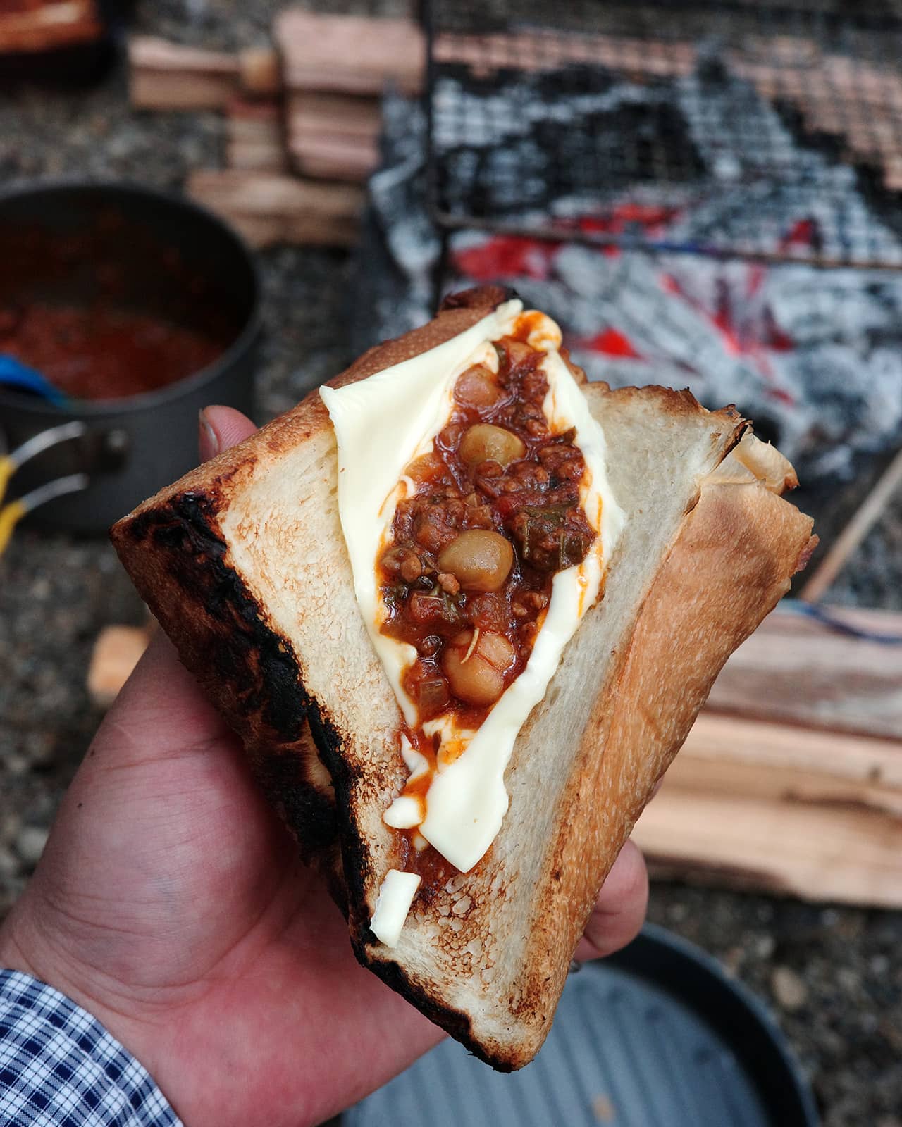 お腹もすいたのでその火でそのまま朝ごはんの準備を。昨晩のMAXさん特製チリビーンズとパン屋さんのおいしい食パンで贅沢朝ごはん。