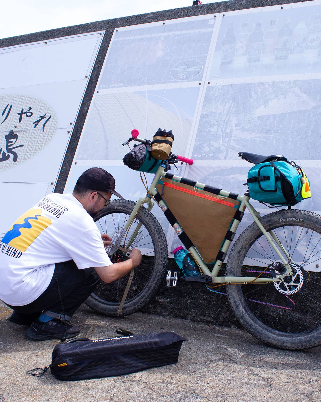 - 行き帰りの輪行でバイクに持たせた荷物を外すことがわかっていたので、外したミニバッグたちを一つにまとめて持ち歩くために137toteを使用。ガバッと開いた口にポイポイ出し入れできるのも旅全体を通して楽で役立ちました。バスケットは買い出しの時便利。キャンプ場ではテーブルとして、飛行機輪行時にはリアエンドのカバーとしても使えました。 I new that I had to carry all the bags on the bike by hand when rinkoing, so I broght the 137 tote, to put in all my small bags in. Thanks to the huge bag opnening, I was able to throw in and take out a lot of stuff quickly, so the bag came in handy thtoughout the whole trip. The basket helps when you need to put all the groceries you bought for the camp. I also used the basket as a table when camping and used it as a protecter for my bike's rear end when airplane rinkoing.