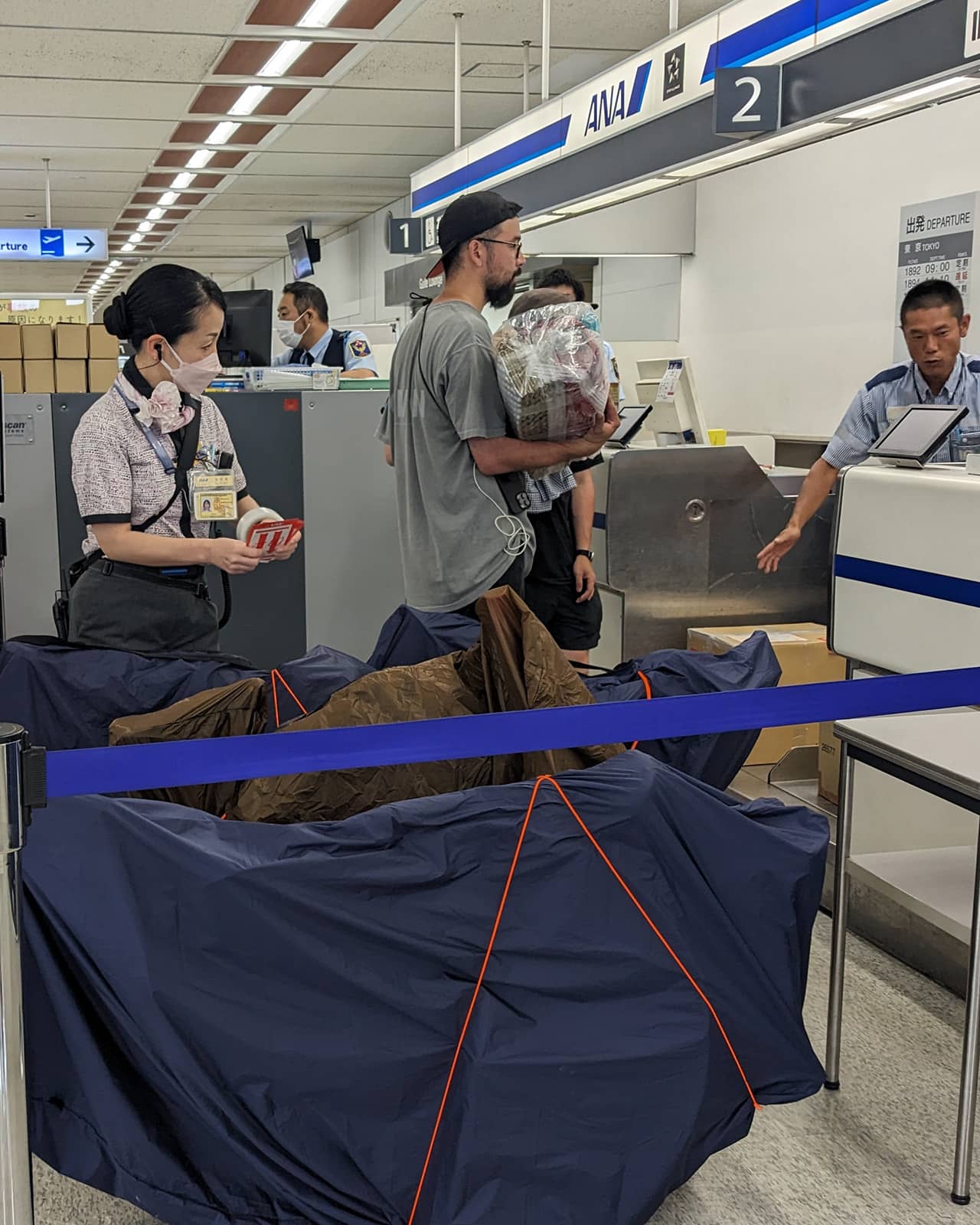 空港に着いたら輪行の準備ですね。行きのフェリーはそのまま載せれましたが流石に飛行機は無理なので各々取り掛かります。(因みにキャンプグッズやらは空港から配送して羽田から帰路を楽にしよう作戦です。無理しないのが良いです。)