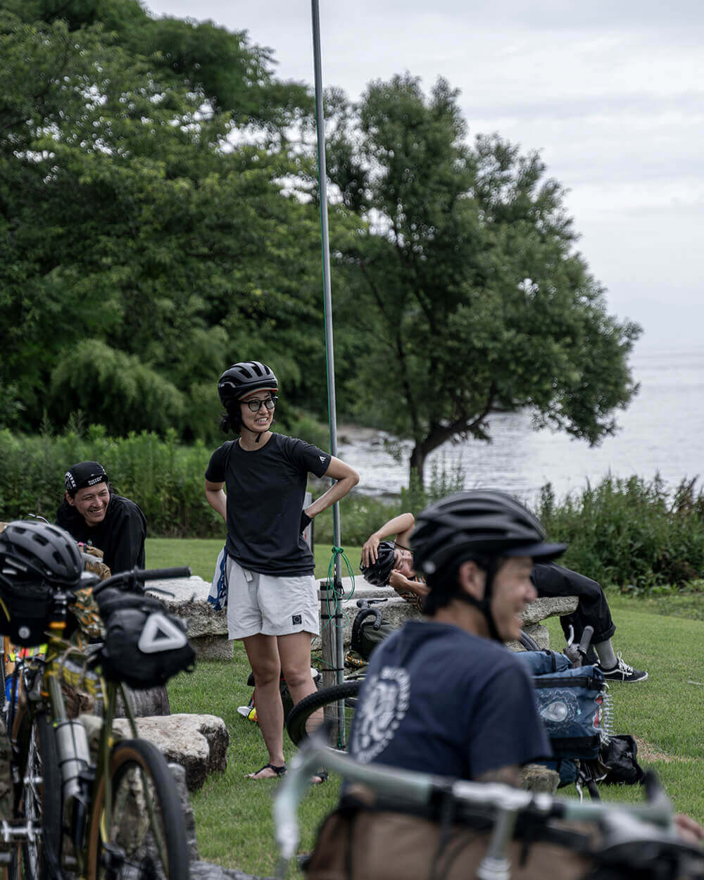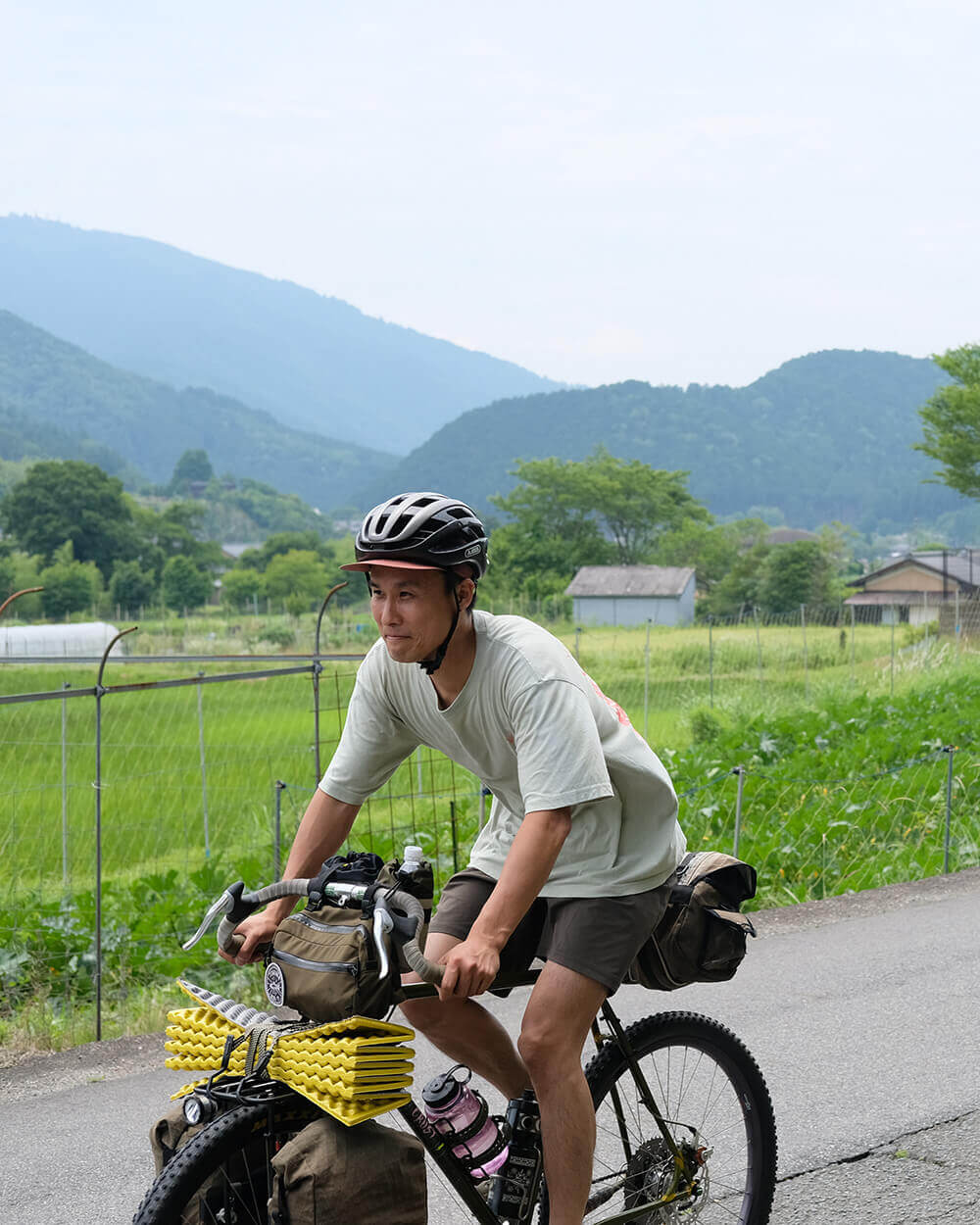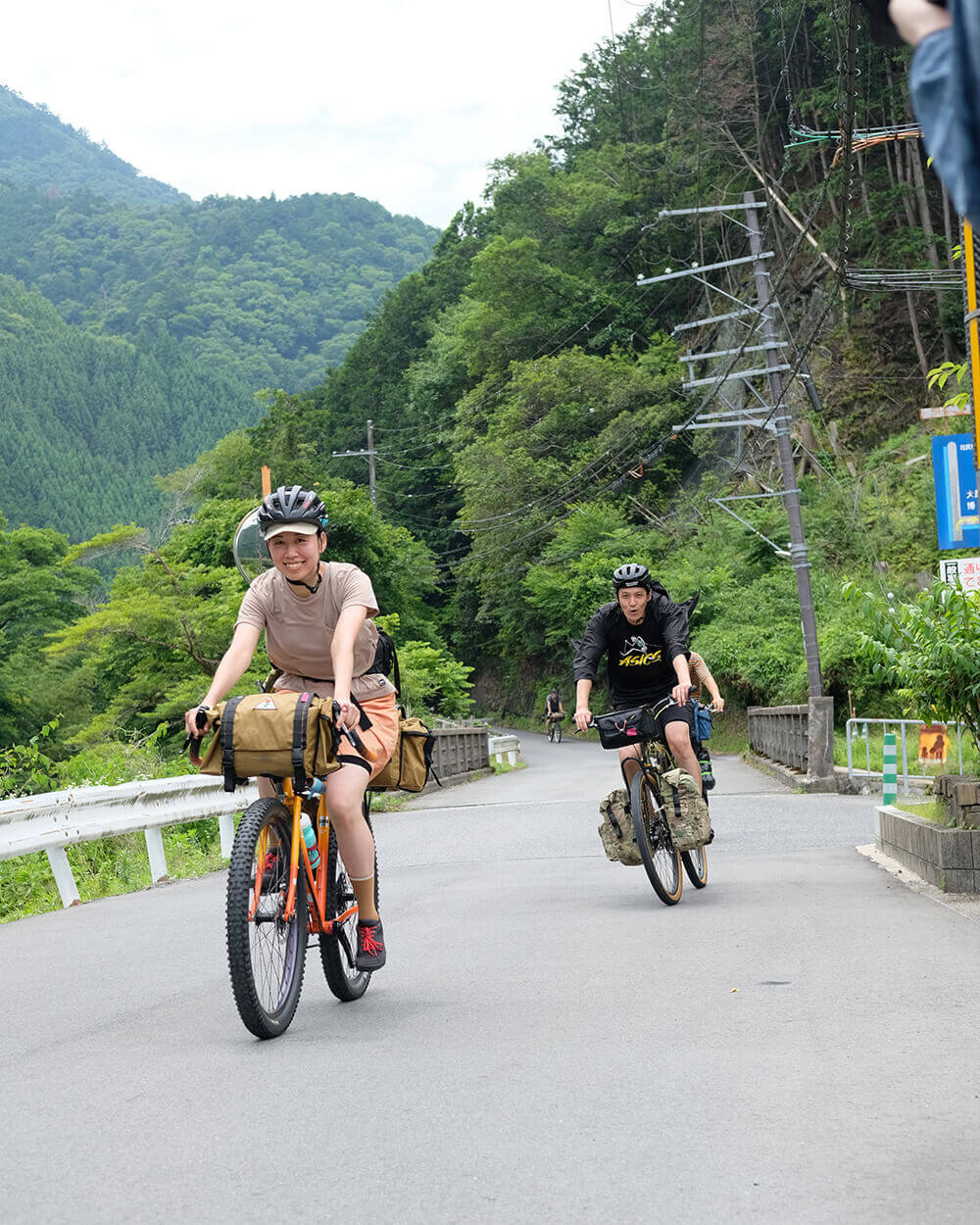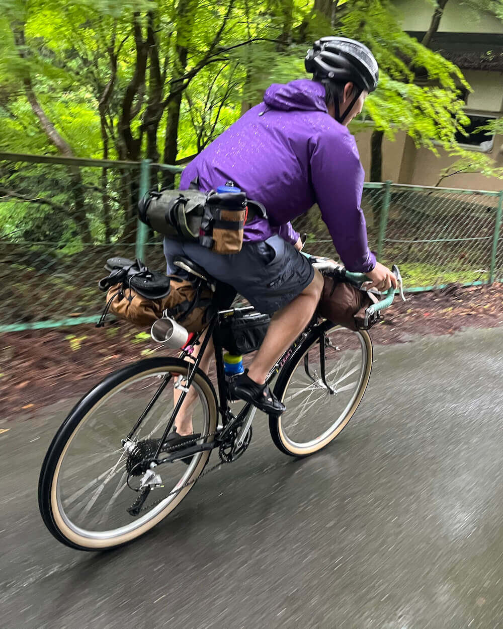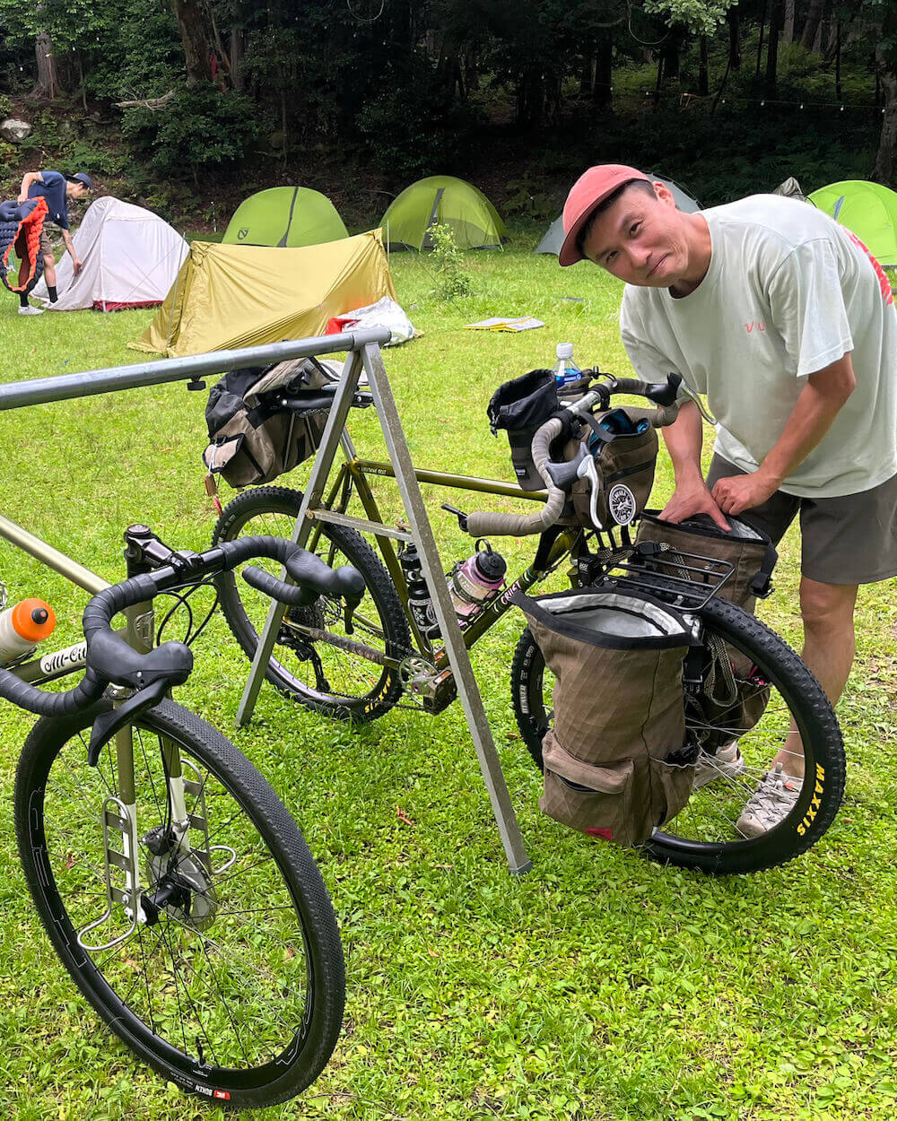 峠を走る時の推進力を上げるためフロントに荷物を多めに積載。 Jr.RangerとZeitgeistにコンパクトで軽量のテント、チェアー、着替えを入れて、Ardea Packにはカメラ、Snack Bombには塩分飴やスマホ、道中で買い出しをして荷物が増えたり、トラブルで他の人が荷物を運べなくなった時用にフロントキャリアに積載できるようにスペースを確保。バッグの色はフレームの色に近いカーキ色をチョイス。全て同じ色合いに揃えました。コーディネートはこーでねーと、、。