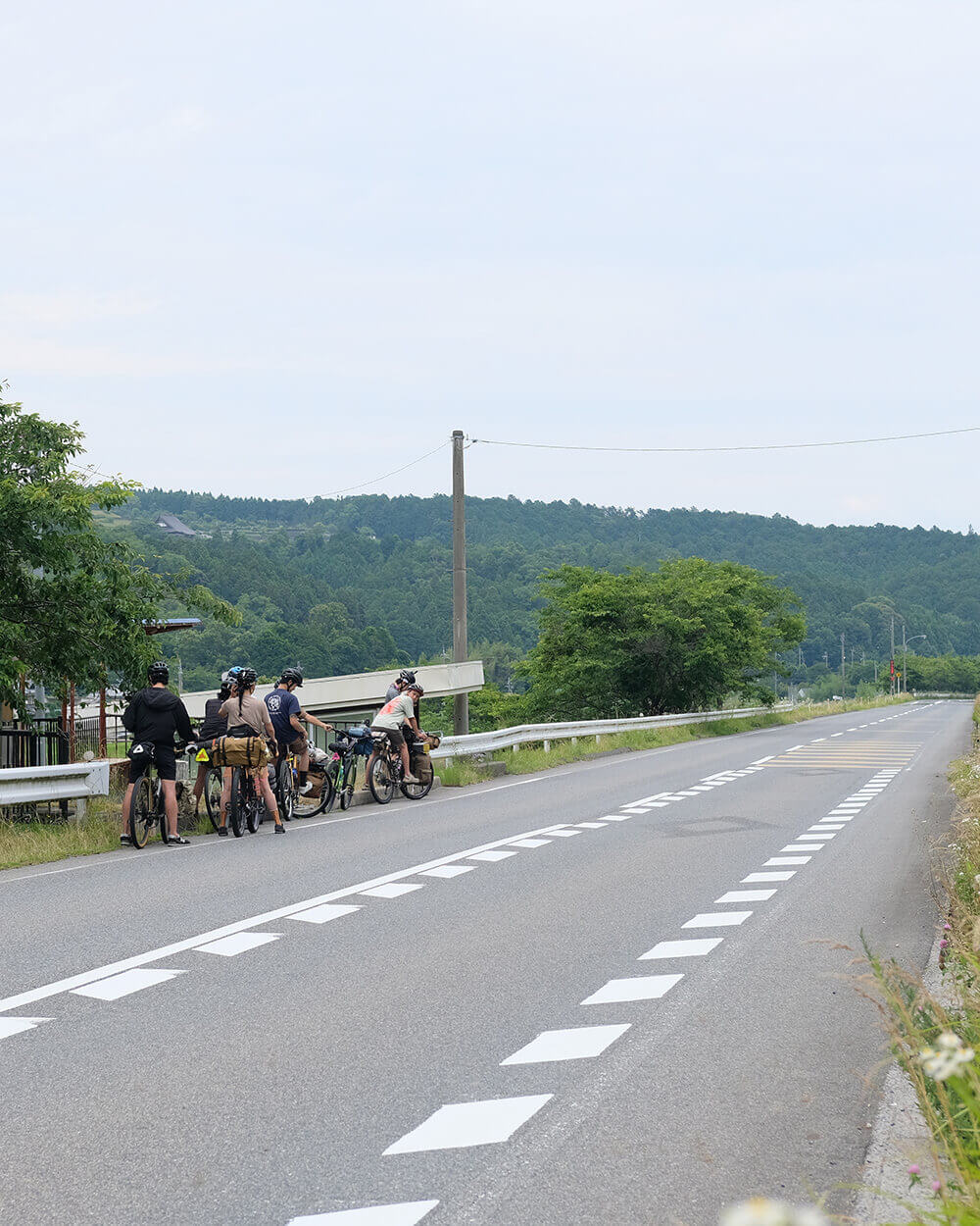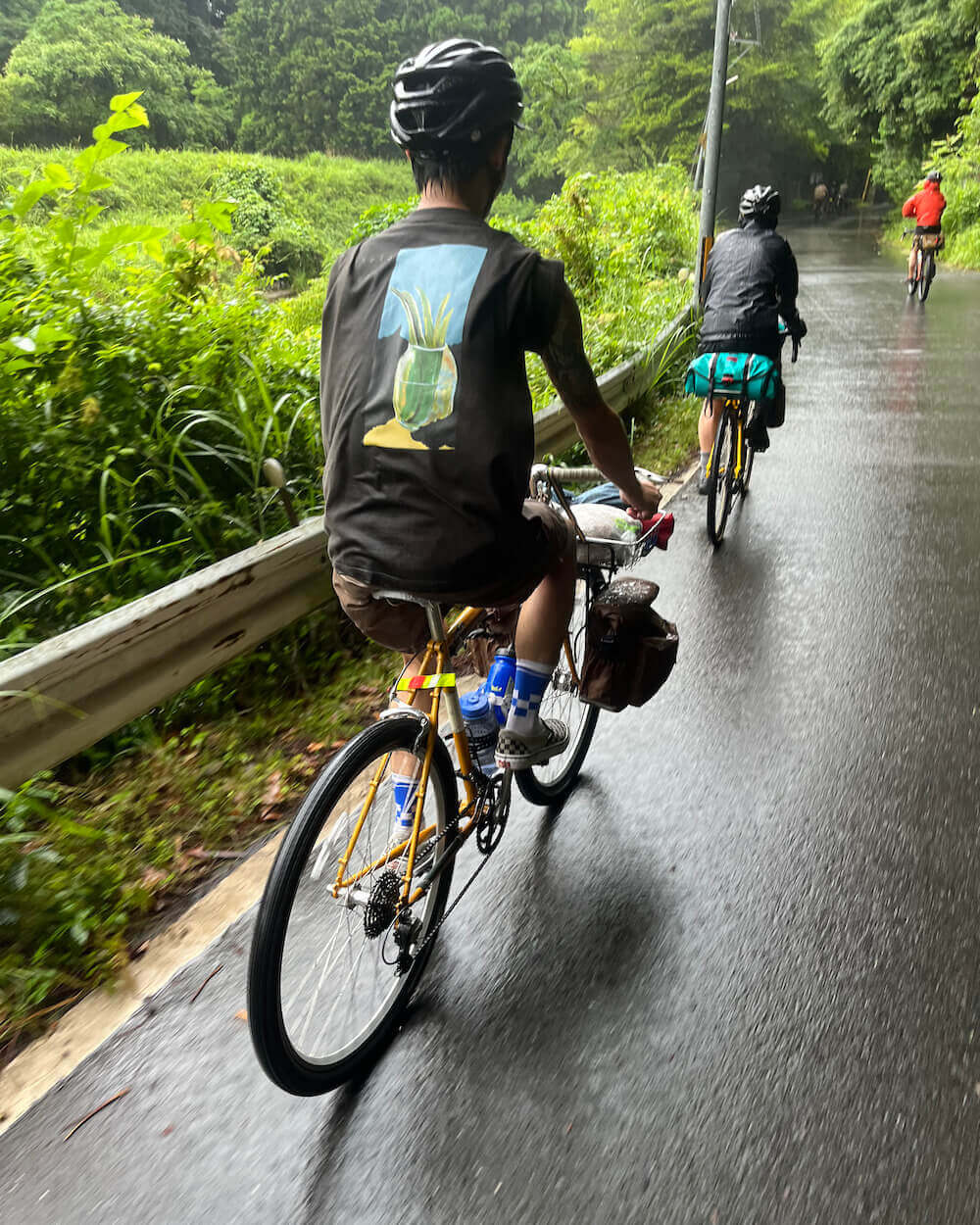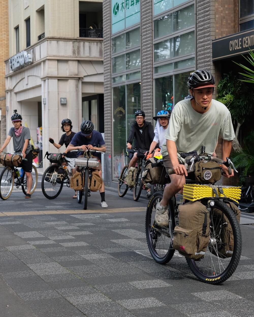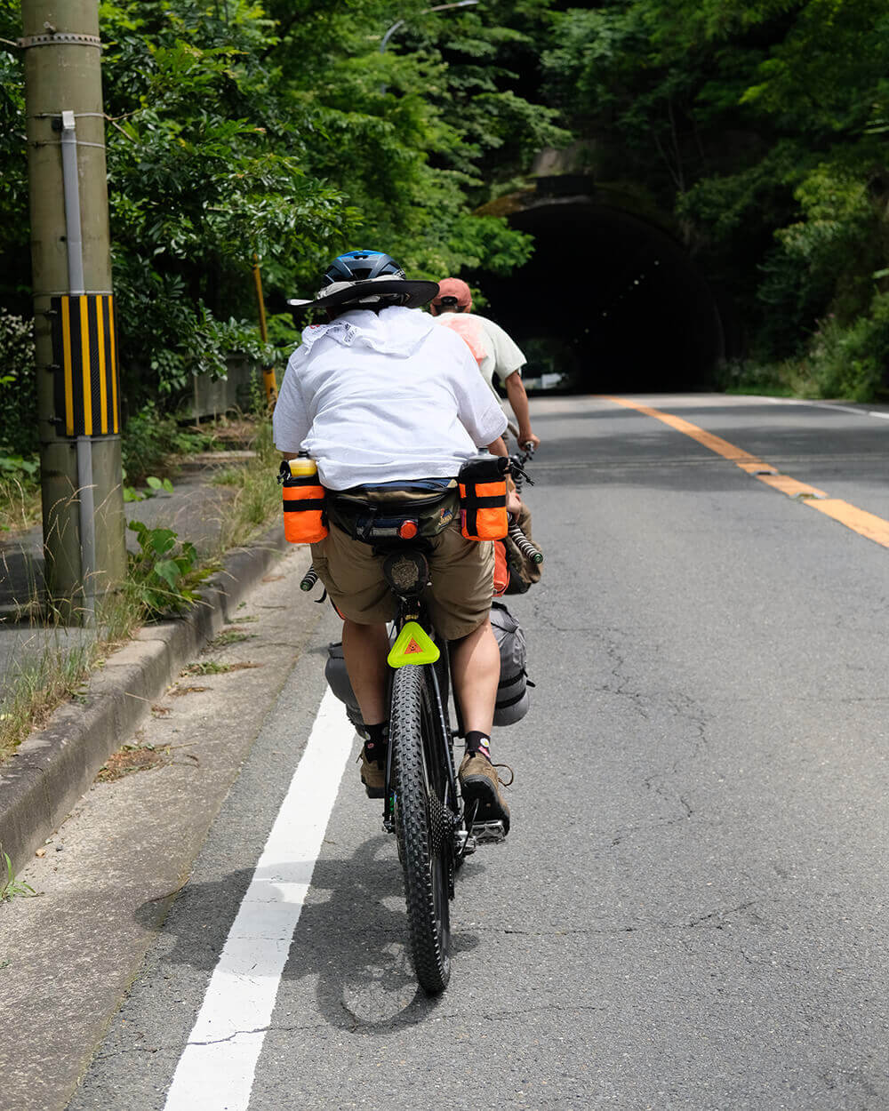 峠を走る時の推進力を上げるためフロントに荷物を多めに積載。 Jr.RangerとZeitgeistにコンパクトで軽量のテント、チェアー、着替えを入れて、Ardea Packにはカメラ、Snack Bombには塩分飴やスマホ、道中で買い出しをして荷物が増えたり、トラブルで他の人が荷物を運べなくなった時用にフロントキャリアに積載できるようにスペースを確保。バッグの色はフレームの色に近いカーキ色をチョイス。全て同じ色合いに揃えました。コーディネートはこーでねーと、、。