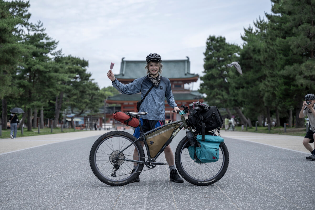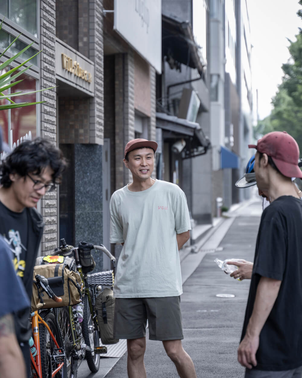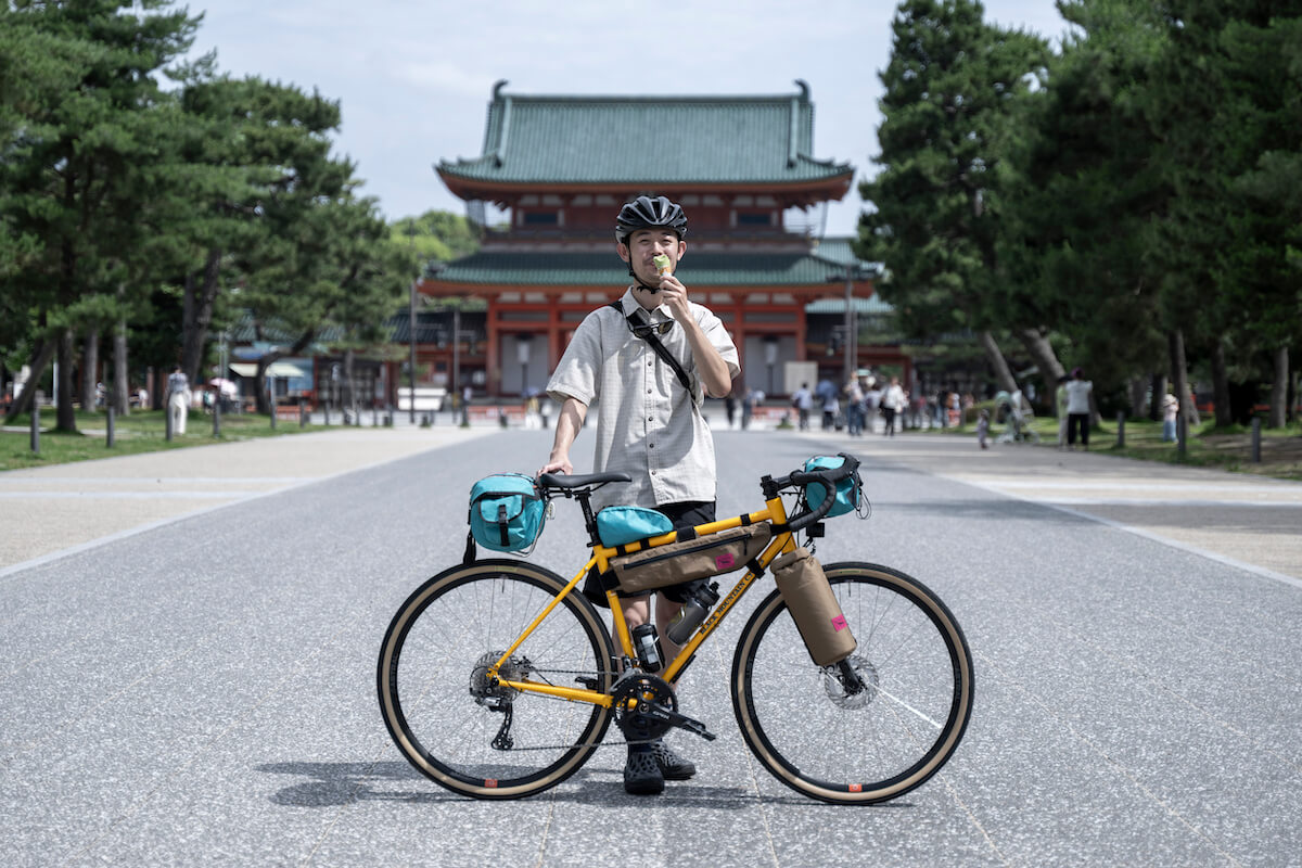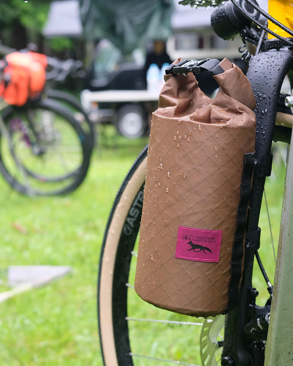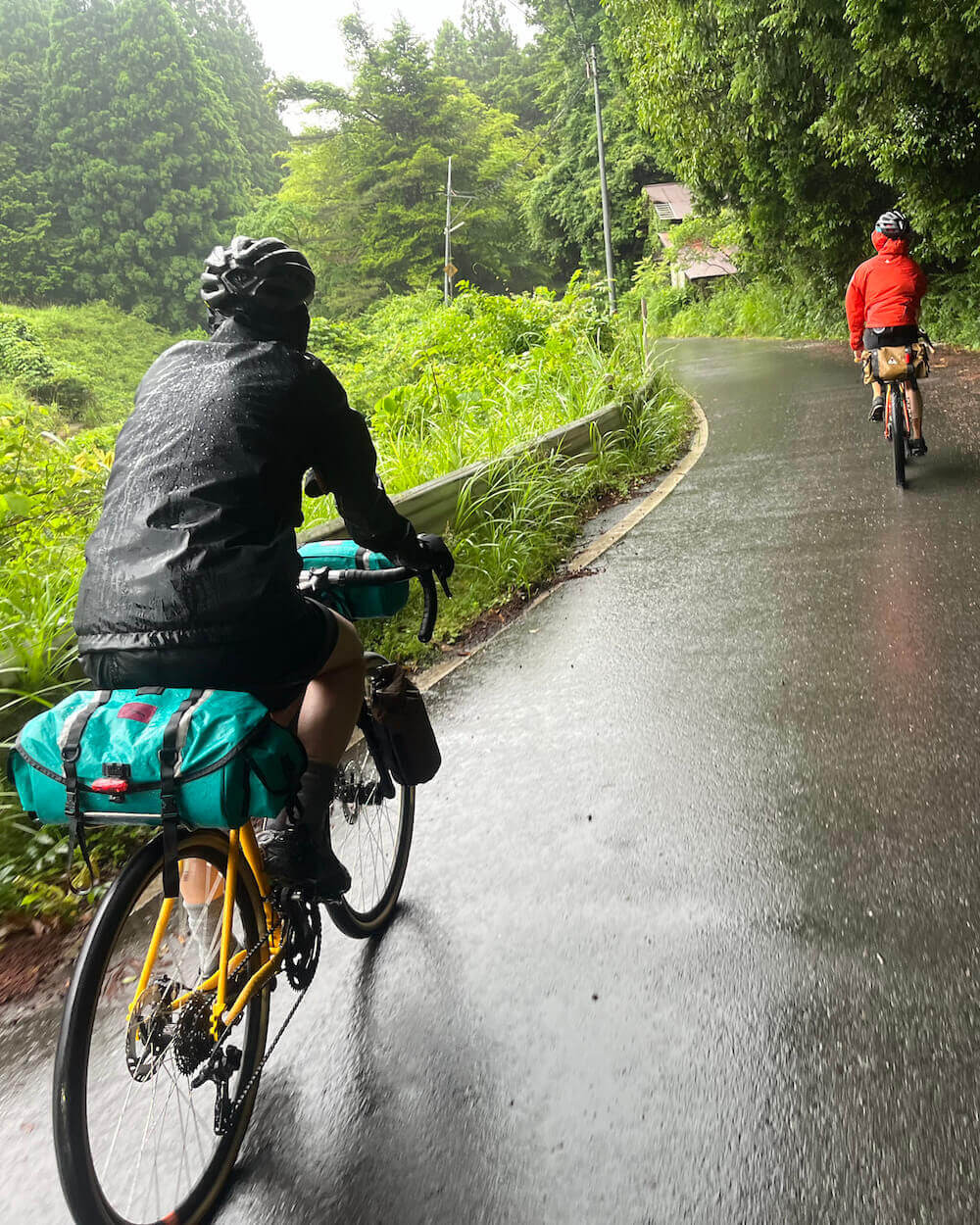 峠を走る時の推進力を上げるためフロントに荷物を多めに積載。 Jr.RangerとZeitgeistにコンパクトで軽量のテント、チェアー、着替えを入れて、Ardea Packにはカメラ、Snack Bombには塩分飴やスマホ、道中で買い出しをして荷物が増えたり、トラブルで他の人が荷物を運べなくなった時用にフロントキャリアに積載できるようにスペースを確保。バッグの色はフレームの色に近いカーキ色をチョイス。全て同じ色合いに揃えました。コーディネートはこーでねーと、、。