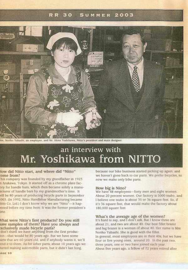 Nitto can bend metal in ways that other makers just plain can't Mr. Yoshikawa, who designs most of Nitto's products, has an eye for beauty that, in my experience, is unmatched. He takes our ideas and rough sketches, and turns them into stunnigly lovely shapes -- the Moustache Handlebar, the Noodle Bar -- and he test the heck out of them to make sure they're safe.